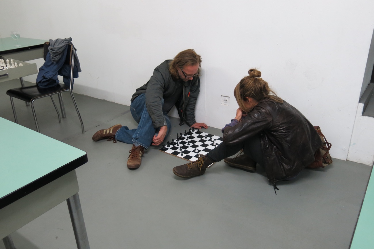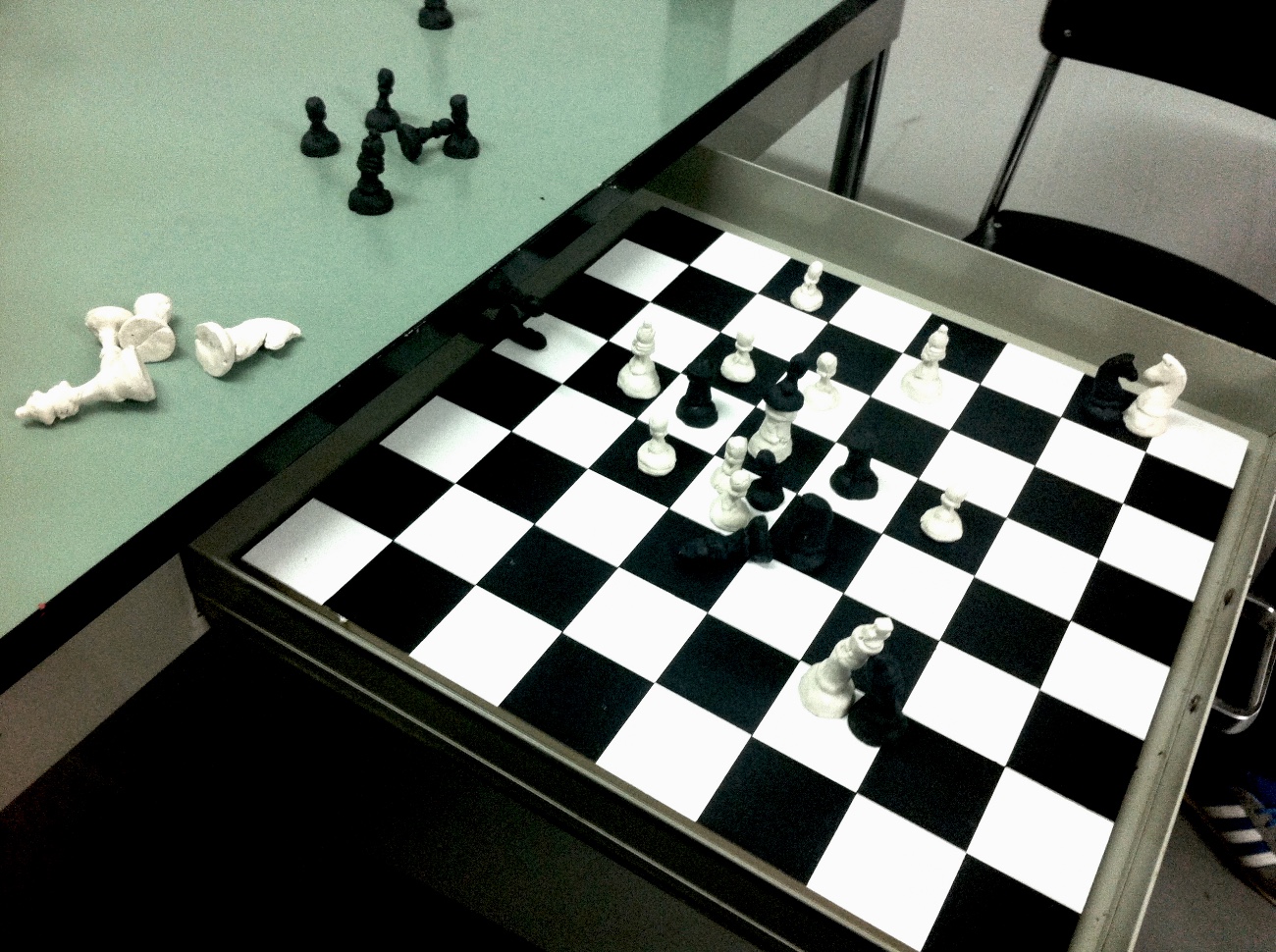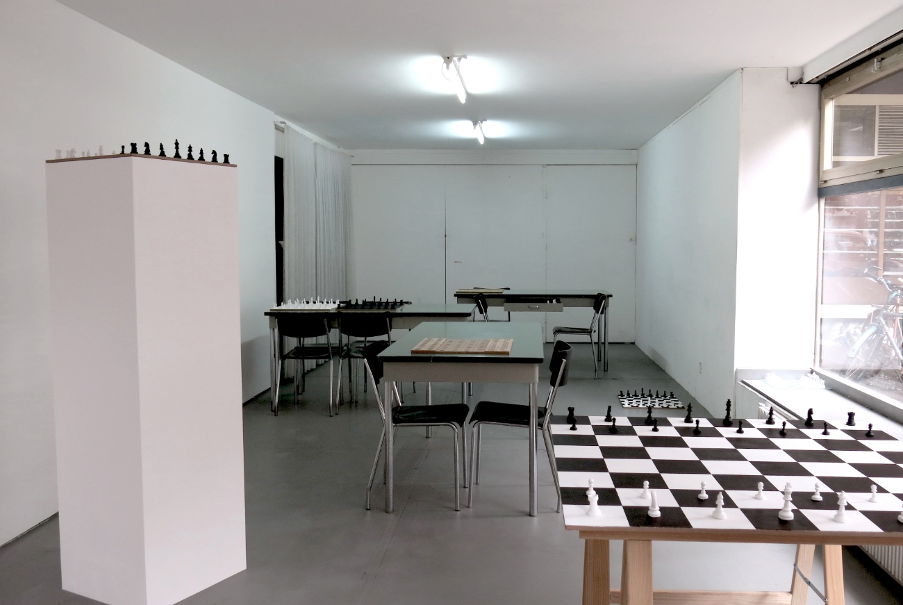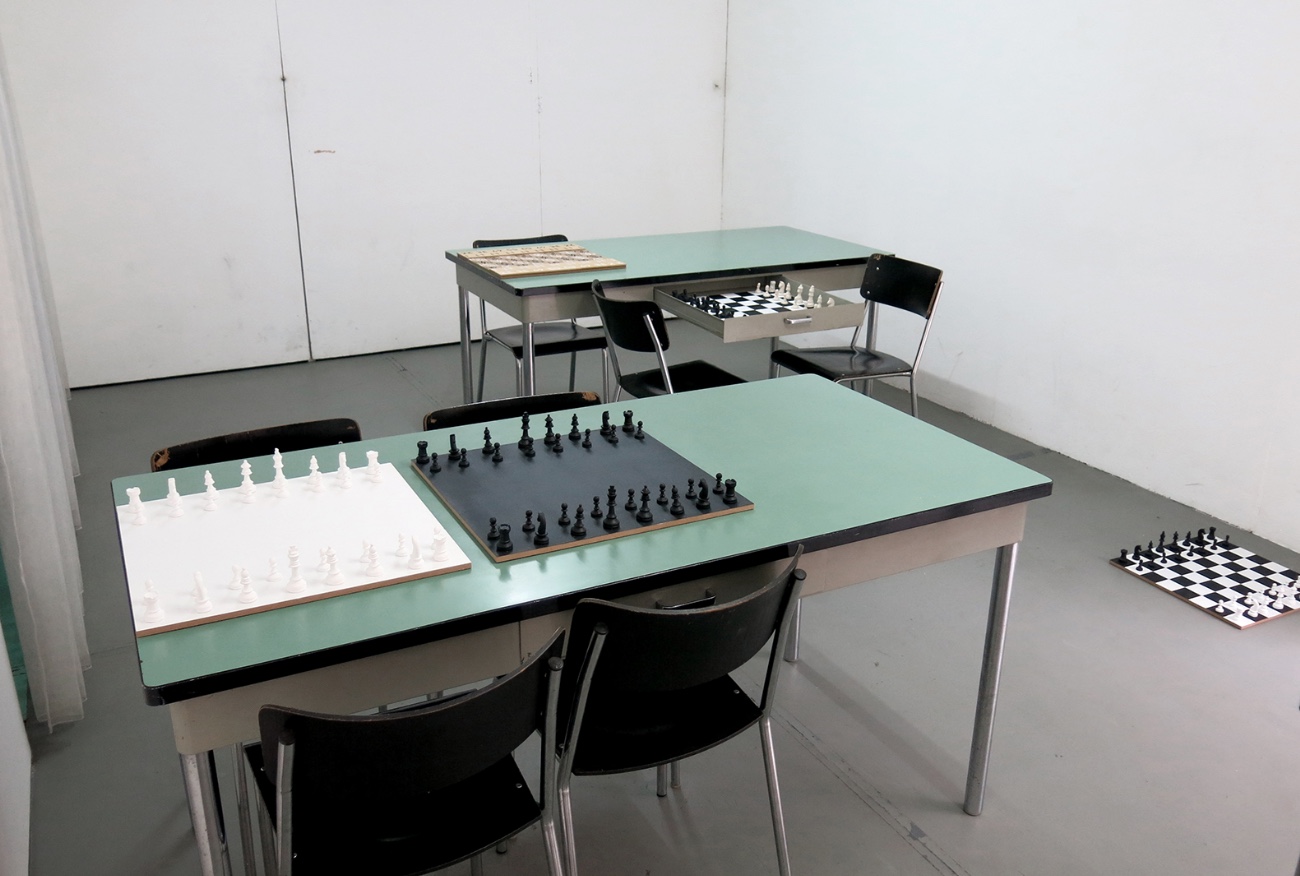 - set de 10 jeux d’échecs hand-made se répondant par paires de contraires (plateaux : bois, acrylique / pièces : plâtre, pâte-à-modeler, verre, acrylique), dimensions variables