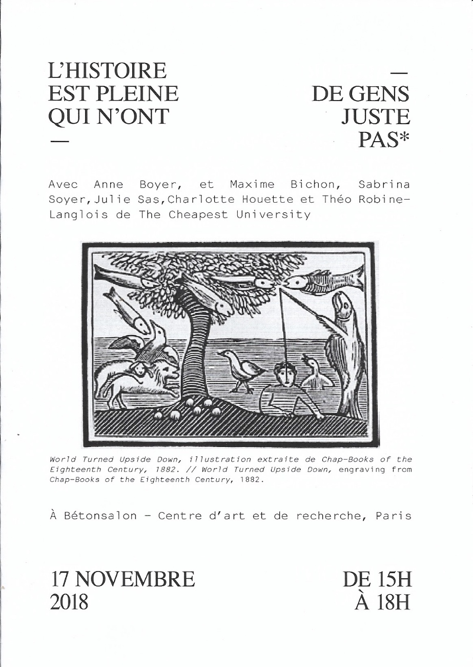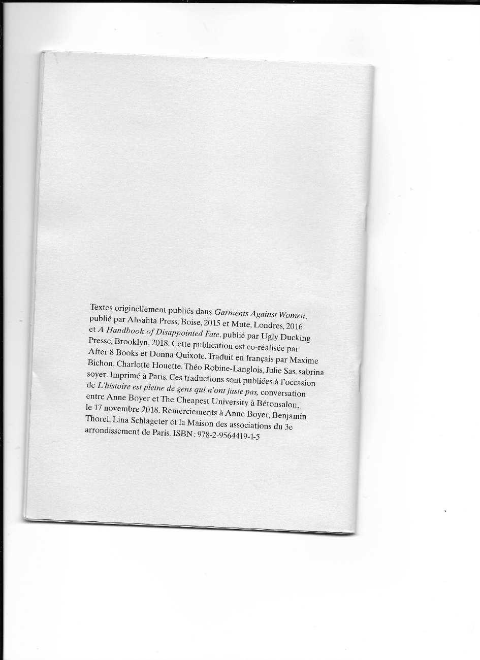 - discussion entre The Cheapest University et Anne Boyer, Bétonsalon, 17 novembre 2018 Editions de traductions d’Anne Boyer (traductions : Maxime Bichon, Charlotte Houette, Théo Robine-Langlois, Julie Sas, sabrina soyer), ed After 8 books et Donna Quixote Press, Paris, 2018