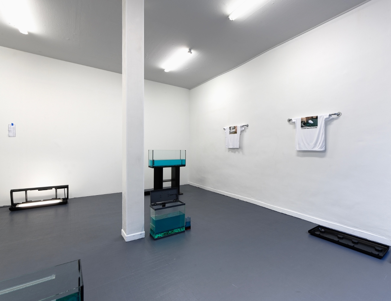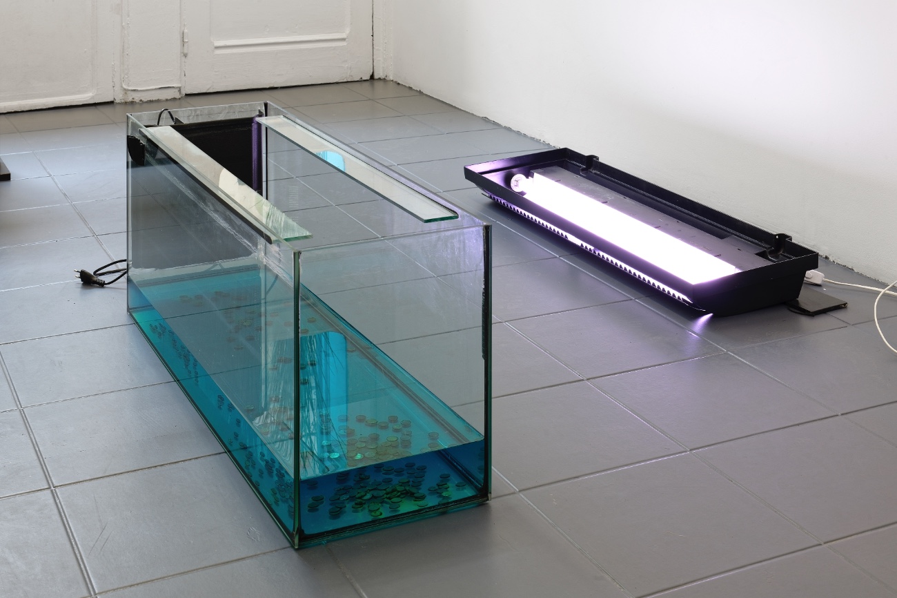 - Sans titre, 2023 - acquariums, mobiliers d'acquarium, eau, gel douche, 725 pièces de 1 centimes d'euros.