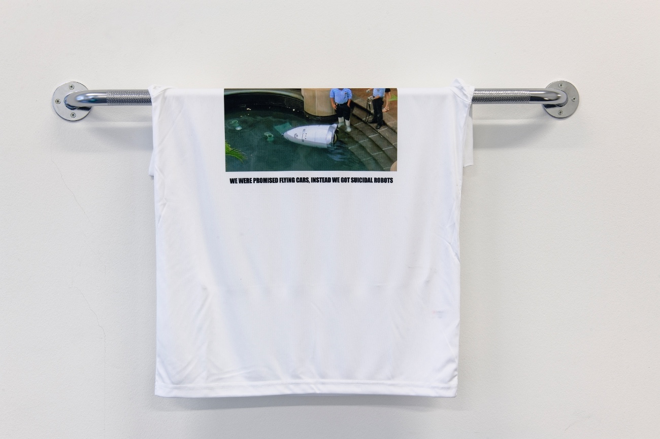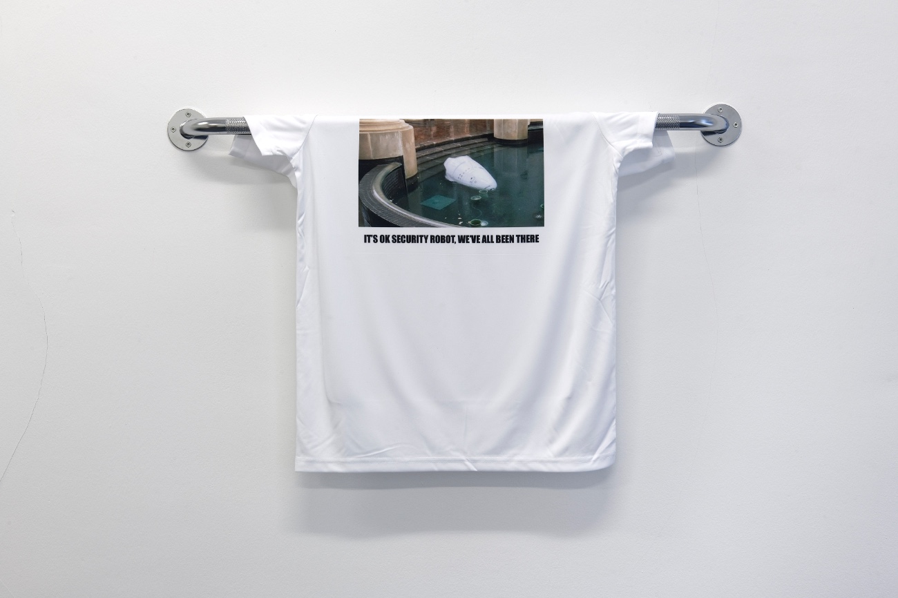 À l’origine de cette exposition, il y a une histoire séduisante (et clickbait) : en juillet 2017, un robot de surveillance du modèle K5, produit par Knightscope, une firme de la Silicon Valley basée à Moutain View, plonge dans le bassin du centre commercial où il opère. Plouf. L’histoire, tournée sous l’angle du « robot suicidaire », est largement médiatisée. Le web étant friand de toutes les variations sur le thème de la machine douée de conscience/émotions/intelligence, la hype est là.