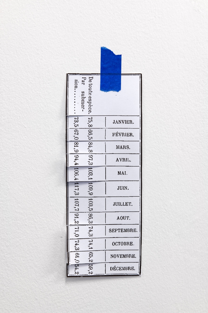 4. Punaisée au mur comme les petites annonces à l’entrée des supermarchés, la reproduction d’un tableau statistique de la répartition en fonction des mois de l’année des suicides par submersion en France, sur la période 1872-1878, tableau tiré de l’ouvrage Le Suicide, une étude sociologique publiée par Emile Durkheim en 1897.
