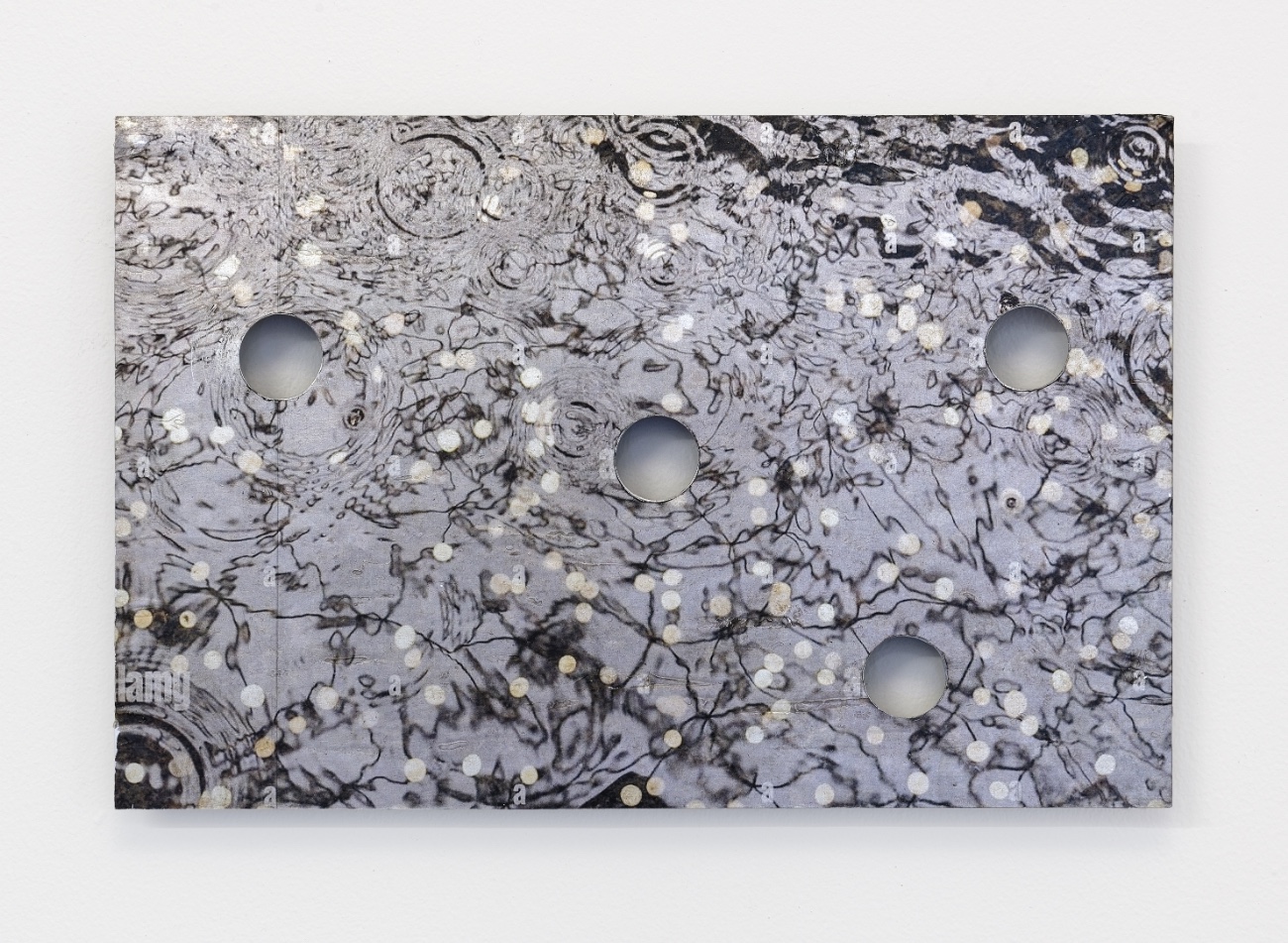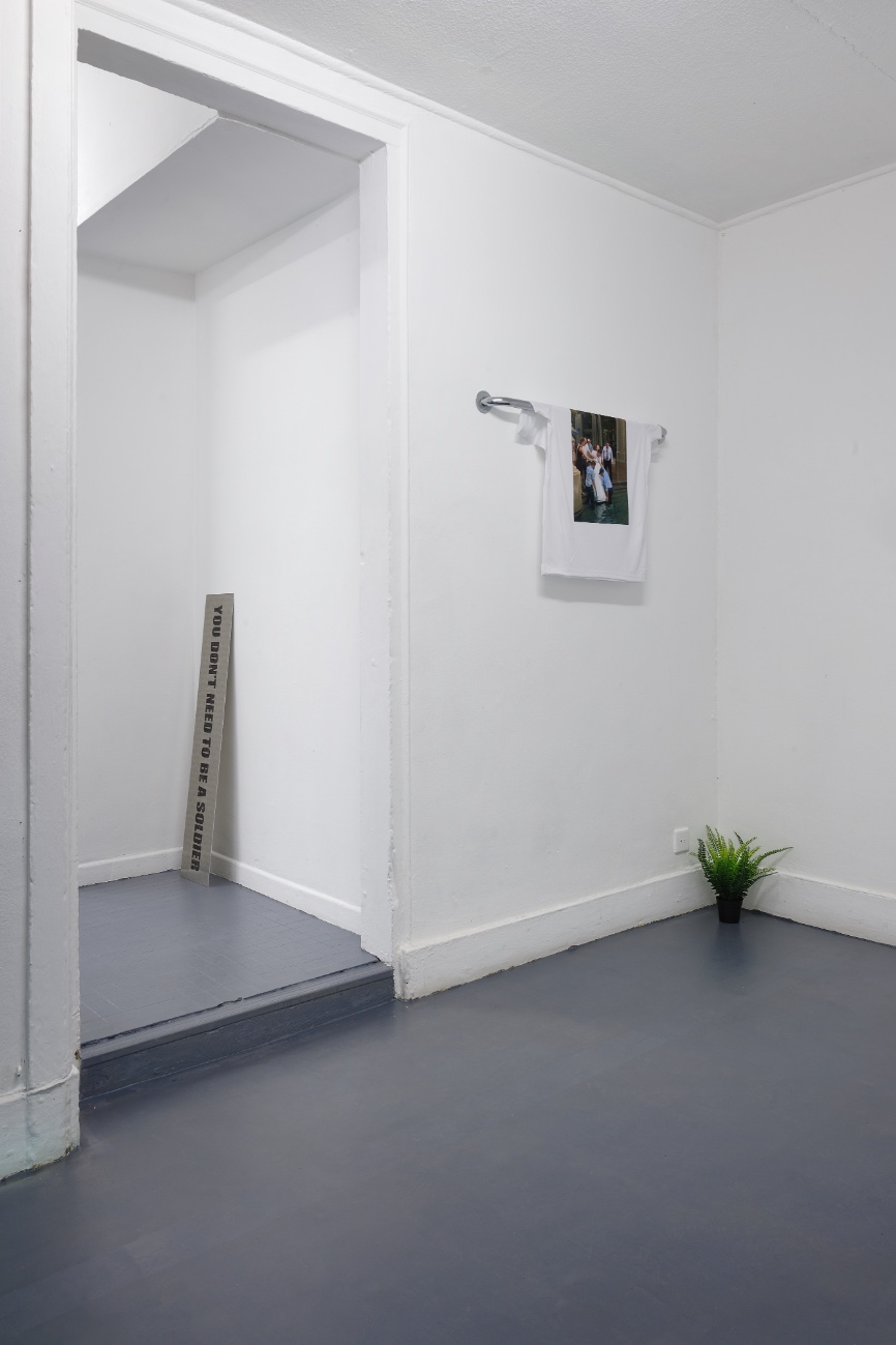 5. Deux pièces sculpturales en métal imprimé. La première, posée au sol, reprend une phrase (« you don’t need to be a soldier »), trouvée par l’artiste dans un catalogue de vente par correspondance SEARS des années 1930. Elle est ici tronquée (à l’origine, la publicité disait : « you don’t need to be a soldier to wear you own t-shirt »). La seconde, au mur, reprend une photographie tirée de la banque d’images ALAMY. Elle représente des pièces jetées au fond d’un bassin.