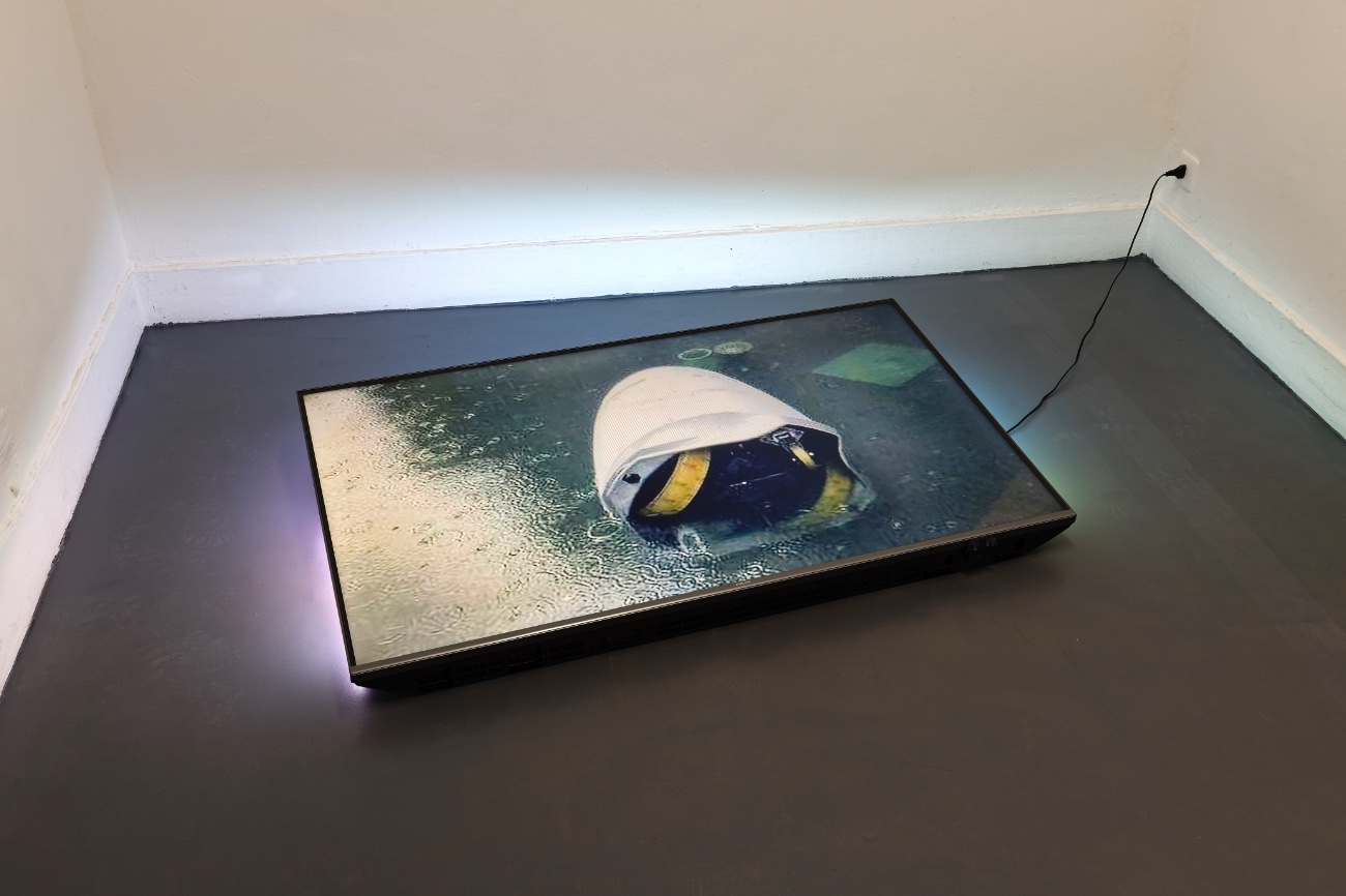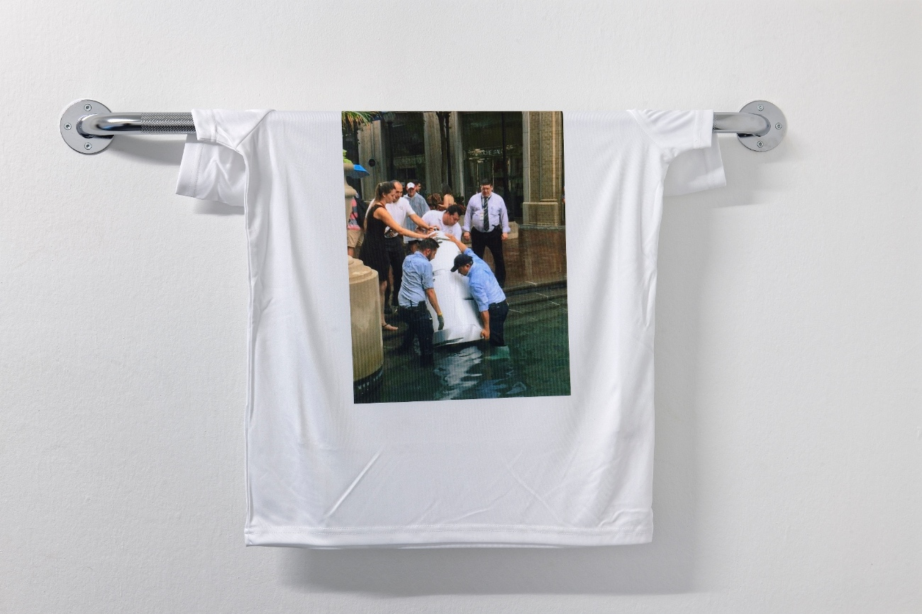 Mais ce n’est pas cet axe anthropomorphique, énième itération d’un mythe aussi ancien que vivace, qui intéresse Julie Sas dans cette anecdote, mais plutôt la richesse de ses potentialités dérivatives. En effet, l’artiste a engagé à partir de ce fait divers une enquête au cours de laquelle elle a recueilli commentaires, informations, et images, notamment différentes photographies présentant le robot immergé dans la fontaine, ou d’autres montrant des forces de l’ordre et des passants en train d’essayer de l’en tirer. L’anecdote et l’enquête qui lui fait suite déterminent ainsi l’inclusion dans l’exposition d’un ensemble d’éléments sous la forme d’une installation conceptuelle et spéculative.