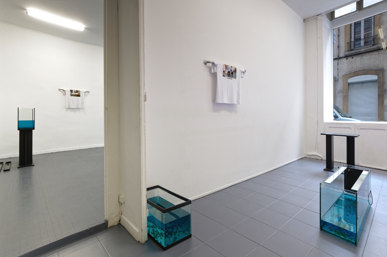 Le troisième fil est techno-militaire, et relève d’une critique du masculinisme : le t-shirt trouve en effet son origine dans la panoplie des soldats de la NAVY, et partant, dans un projet de maîtrise du corps pensé comme viril et une masculinité sacrificielle. Les aquariums sont teintés à l’aide de gels douches genrés : c’est pour vous, messieurs ! Pas besoin de jouer les soldats !