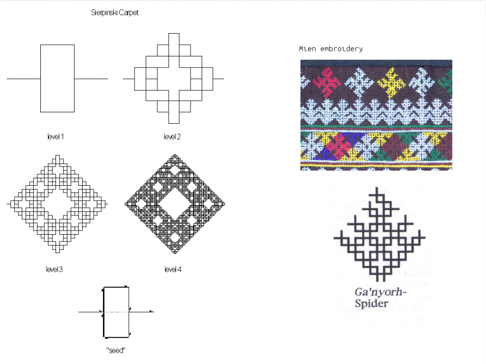 Similarities can be observed between the embroidery patterns of the Mien tribe and the Sierpinski Carpet which is a plane fractal first described by Wacław Sierpiński in 1916. These traditional embroidery’s called Ga’nyorh – Spider, and are used to ornament the clothing of the Lu Mien tribe. Also known as the Yao tribe, they are part of the hill tribes of South East Asia.