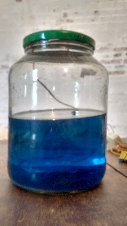 - Add with crocodile clips the anode + in the solution (not entirely sinked) attaching to it a pièce of copper (thick copper wire, or rod or plate..)