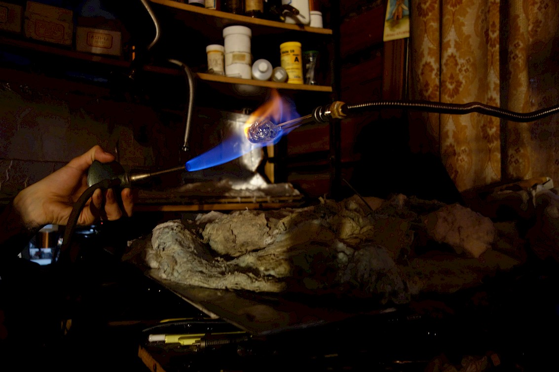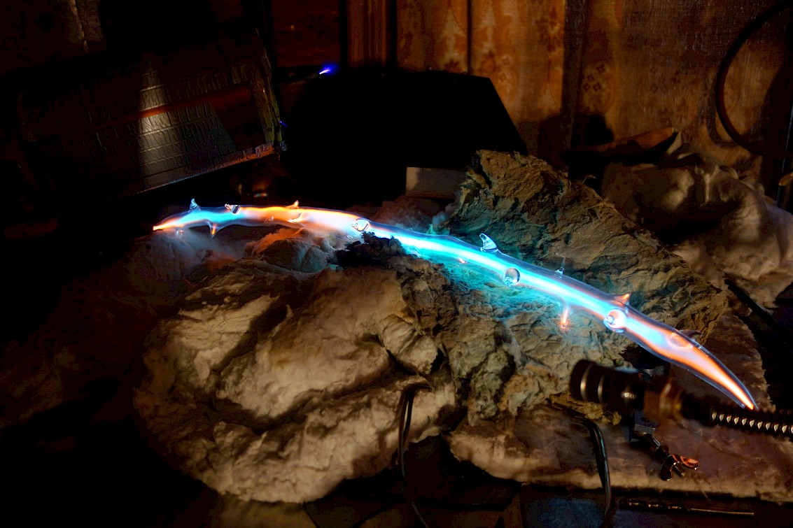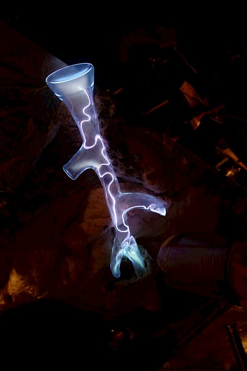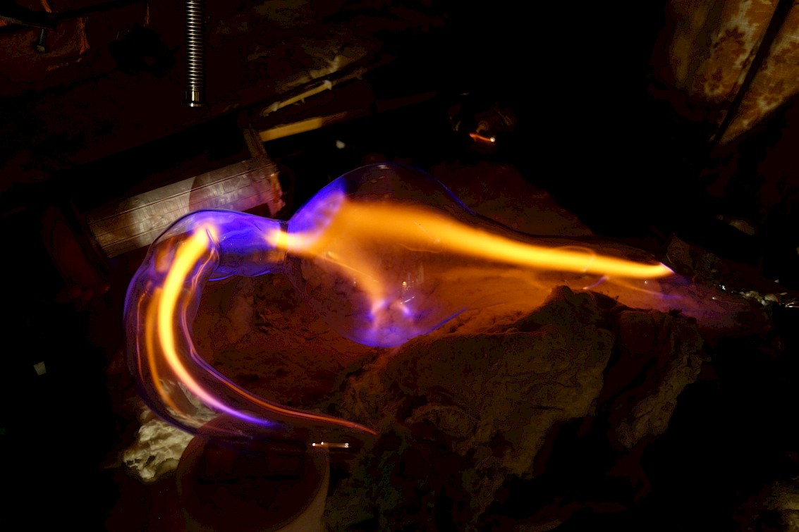 Filling the glass sculpture at Tesla coil lab in Sankt Petersbourgh