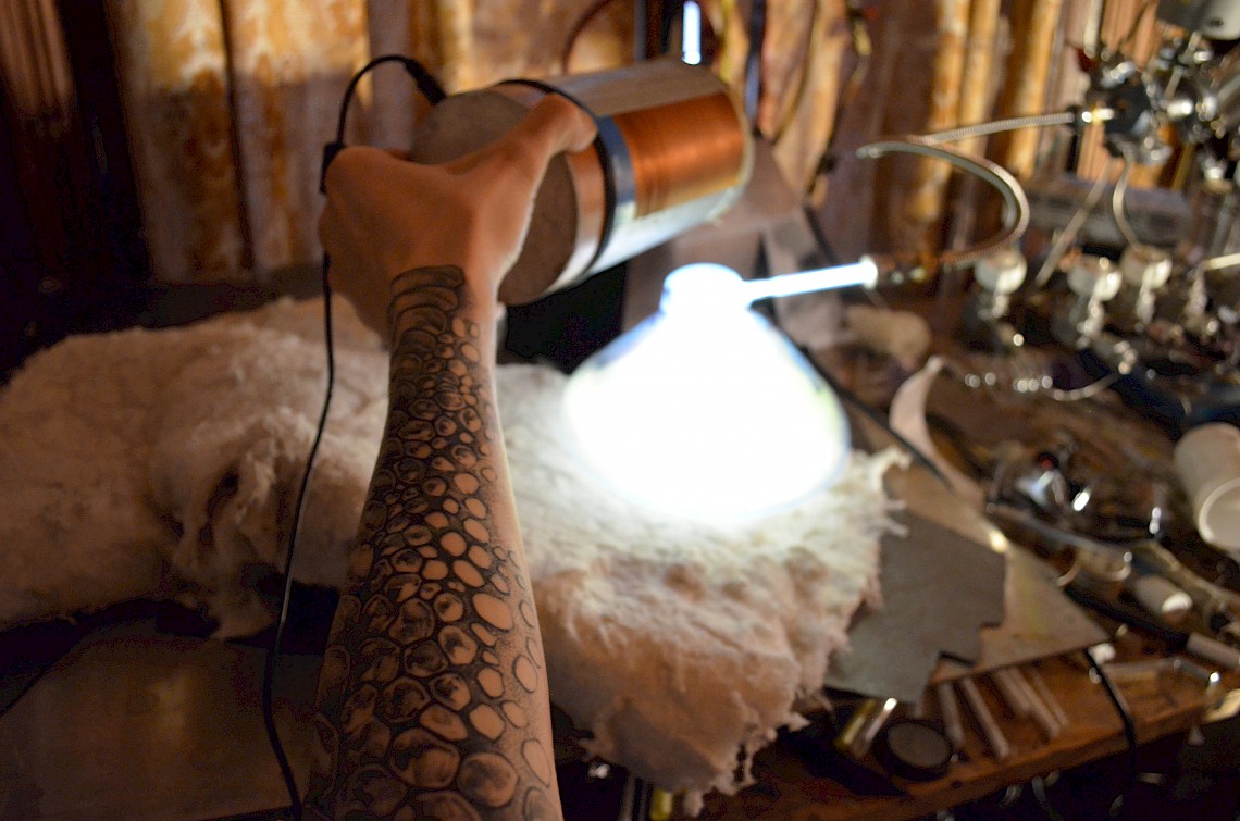 Creating plasma on earth meant to create an artificial environnement to reproduce the atmospheric conditions and ionisation through a strong magnetic field. Inspiration came from 19th centuary scientific machines such as cathode tubes, Geissller or Crookes tubes which used different sorts of noble gases to create beams of light. In modern electronics we use these in cathode ray tubes for tv or our neon signs.