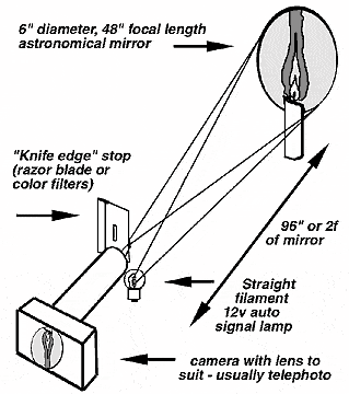 Shadowgraphy, Schlieren Optics, Test de Foucault are different designations for this optic experiment. Using a source of light, a concave miroir and a knife edge, it will allow you to see atmospheric refractions including infrared waves, gases etc. with your bare eyes. It has been technically described by the father of the optics of inhomogeneous media is the great enigmatic Robert Hooke (1635-1703) This unaided visual observation of schlieren effects, in which the pupil of the eye cuts off refracted rays, was not formally recognized as a schlieren technique for three centuries. However, it must have been observed by our curious ancestors even many centuries before Hooke. Hooke described this new field in his famous Micrographia Observation LVIII, which is a thorough and cogent discussion of light refraction due to density variations in the atmosphere and in liquids. With this background he explained a great many phenomena: the twinkling of stars, convection in fluids, "heat haze,"turbulent mixing and eddies, chromatic aberration, stratified flows, hydrostatics, and mirages. Even the modem field of gradient-index optics was presaged. Key among these observations was that of veins (streaks, striae, schlieren) in glass.