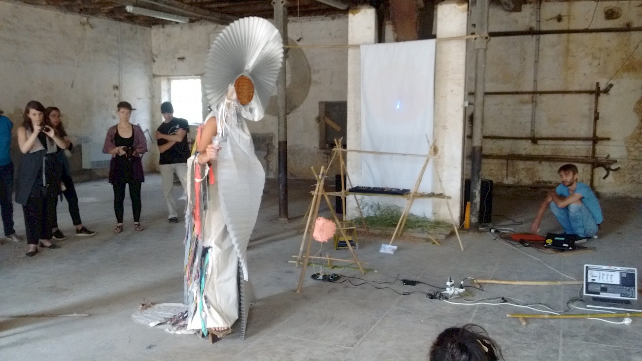 This experimentation was part of the wicked future foucus group at the e-textile summercamp 2017 where we imagined a speculative scenario of what this e textile community leaves behind and how it could be interpreted in the futur by archaeologists or anthropologists. Tourists were invited in a “reserve” that recreated and re interpreted the e-textile artefacts leading to different spiritual, techno-chamanist references.