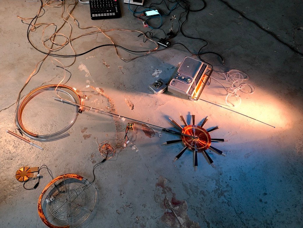 A multichannel system is woven in a visible and non-visible interface using crafted dowsing apparatus and bodies to receive and amplify discrete and unfiltered energies. They reveal electromagnetic auras of resurrected circuits and the ones crossing the space. We plunge into the shadows of our para-communications and listen to the xenovoices that come to manifest.