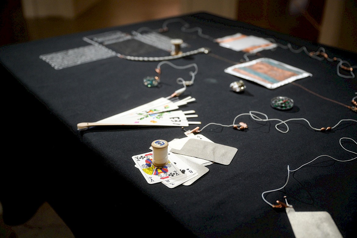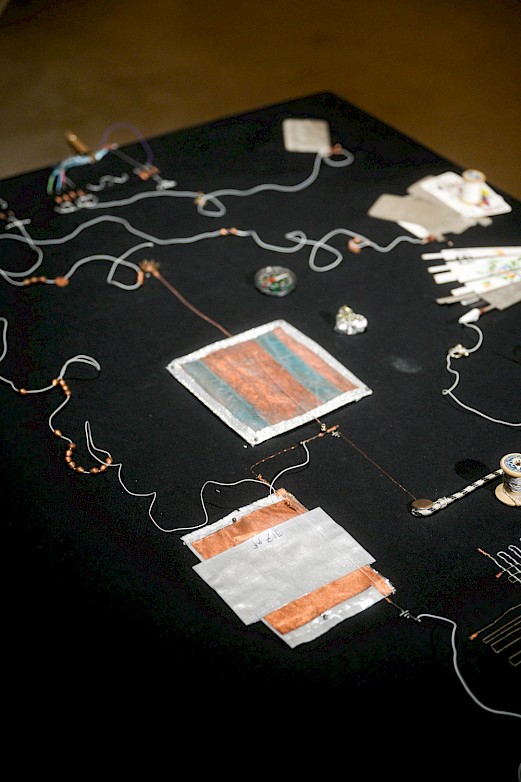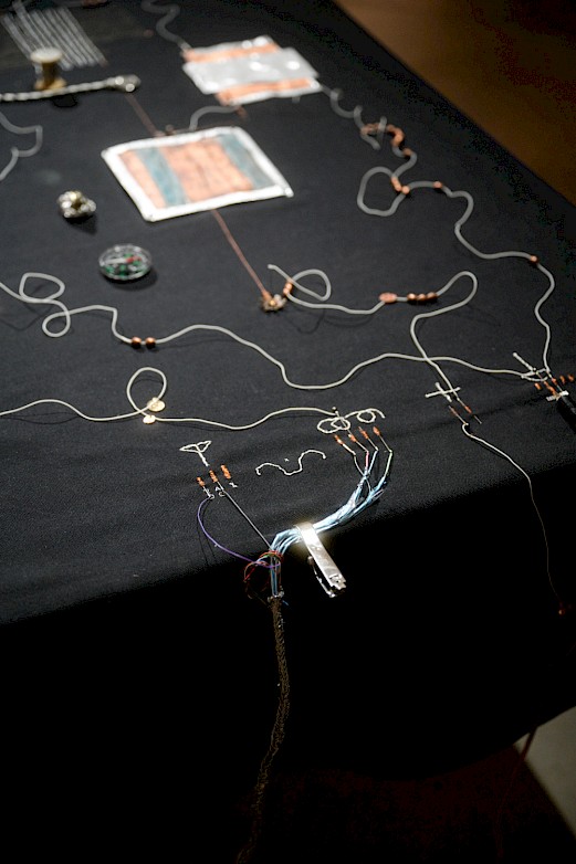 Experimental radio is a research that tries to imagine an electronic embroidered circuit created by these mediums with the textile techniques found in the « Ouvrages de Dames » books. This embroidered radio is a sensing surface that attempts to intercept occult voices through radio waves. They also are in reference to the researches of Nikola Tesla, Thomas Edison, Oliver Lodge and Konstantin Raudive that have looked through radio waves to intercept voices of the spirits.