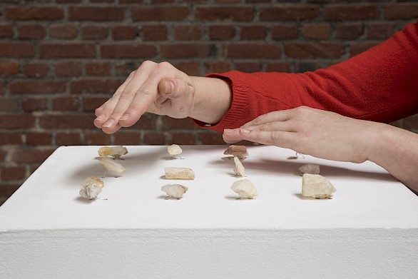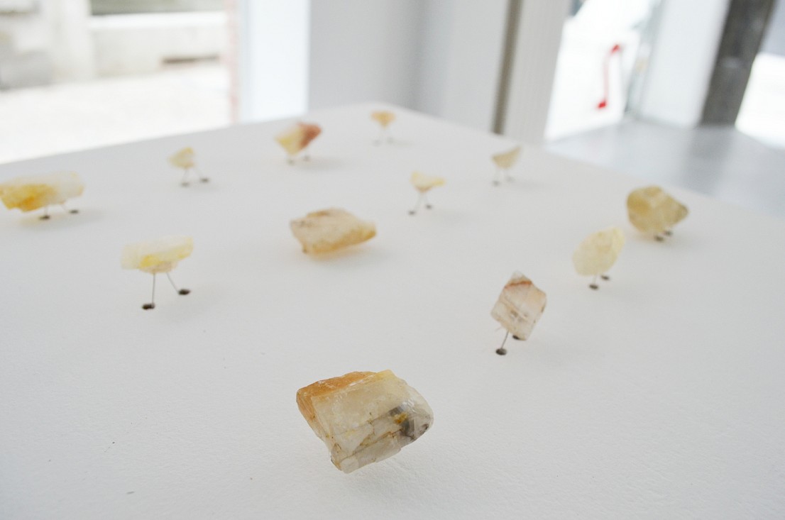 Ces pierres de Calcite formées il y a des dizaines de milliers d'années, ont été prélevées à la carrière du Pont-à-Nôle à Charleroi. Branchées à un oscillateur et des capteurs de lumière, ces pierres translucides laissent entendre leurs subtiles variations lumineuses. En passant sa main au dessus ont est invité à jouer avec ces variations.