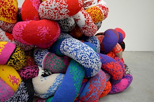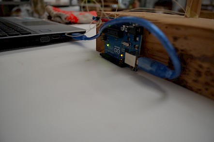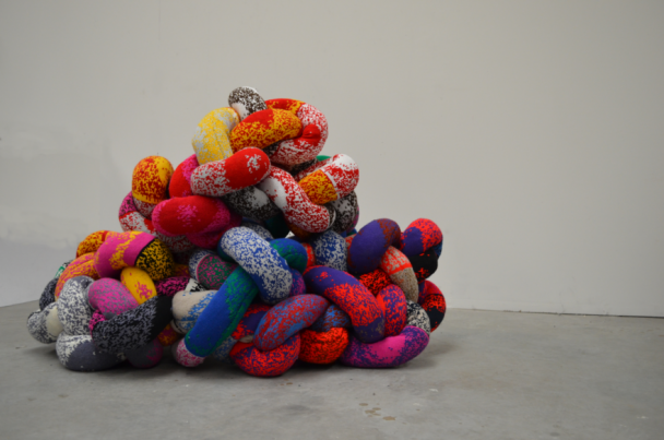 The artwork was knitted throughout a workshop where kids blew on paper windmills to generate a digital pattern that they each knitted on the hacked knitting machines. Meters and meters where knitted in 10 days making a giant thread that was re-knitted to make a sculptural data visualisation.
