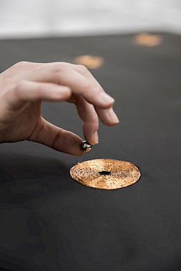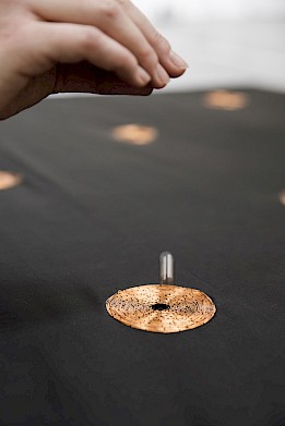 Installation #2 - Diffusion of very low frequencys. People are invited to activate the speakers by placing the magnets on the copper shapes and feel the vibrations of sound.
