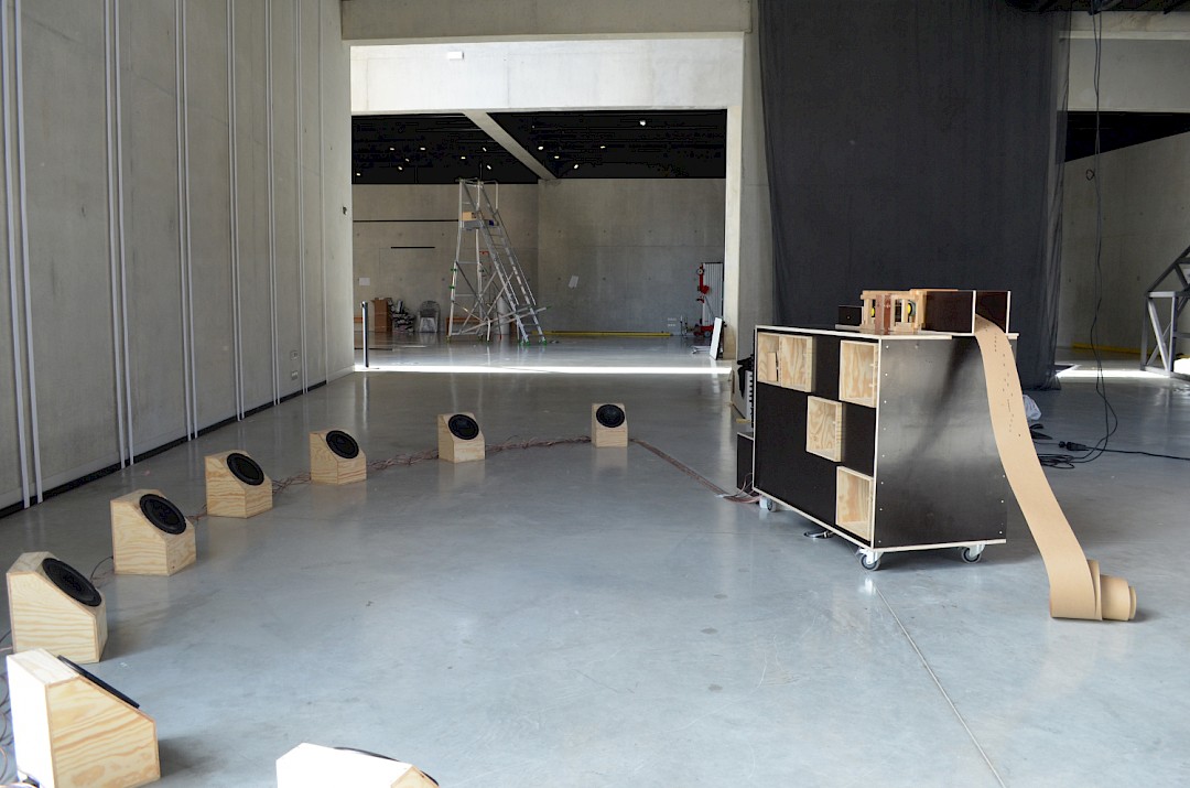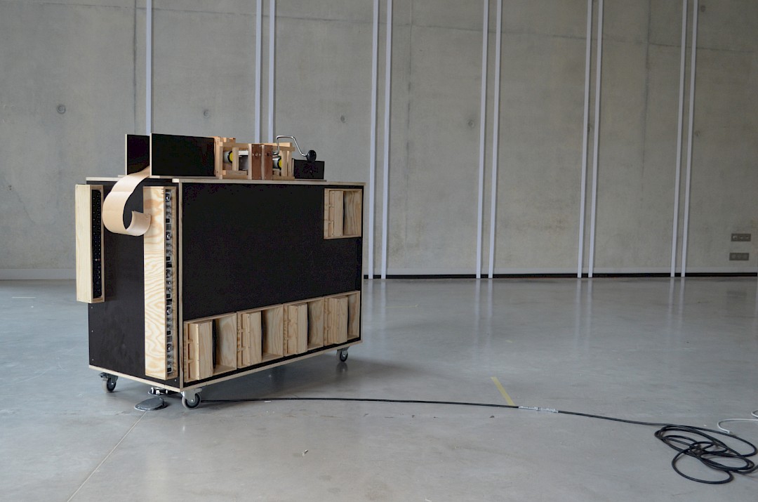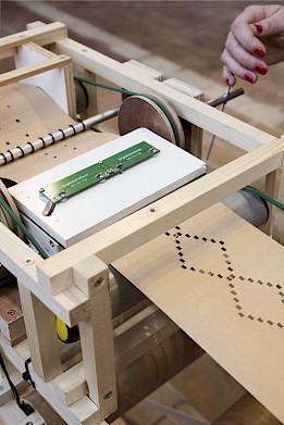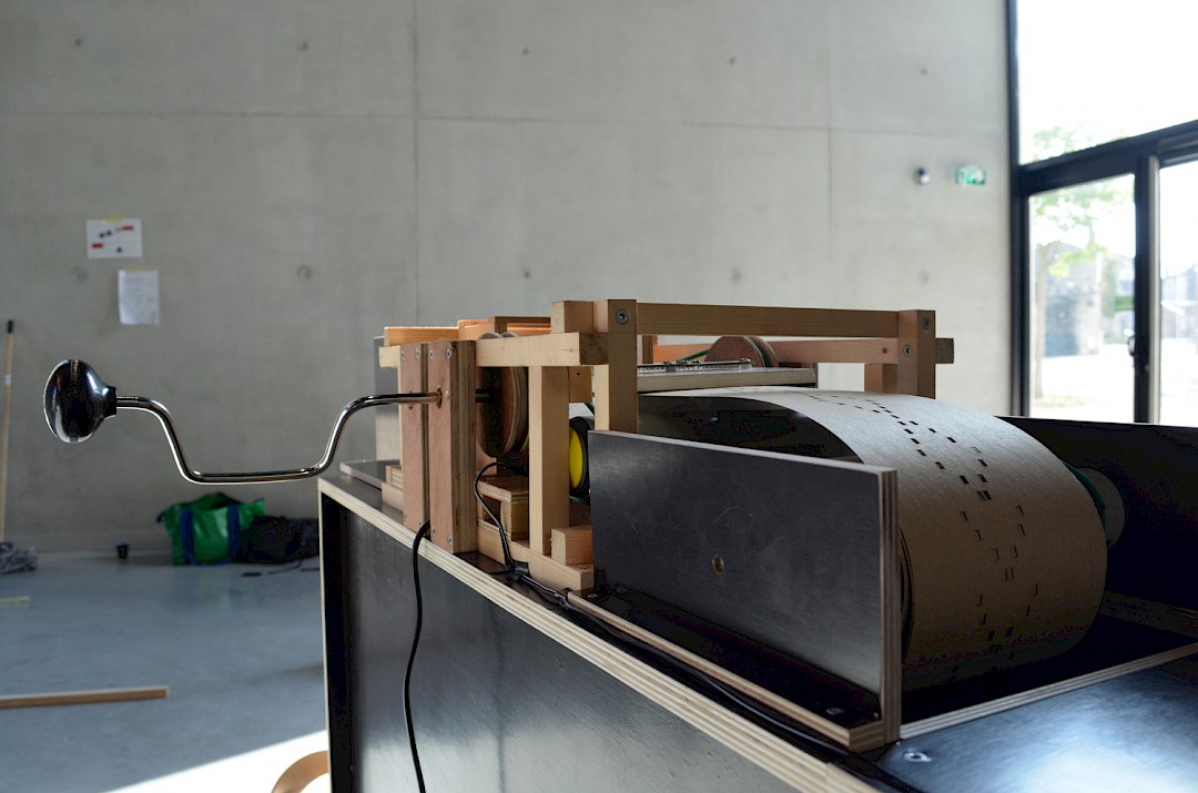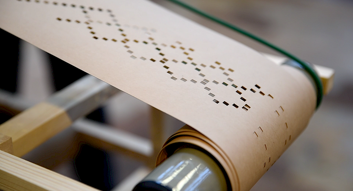 Ce projet est inspiré des liens intimes que les langages textiles, informatiques et musicaux entretiennent. Au 18ème siècle, les systèmes de cartes perforés utilisés par les orgues de barbaries et les métiers jacquards ont inspirés la base de nos systèmes informatiques. Cette installation sonore, électro mécanique interprète une partition de cartes perforés, mêlant sons acoustiques et motifs. Les visiteurs pourront ainsi remixer cette partition rendant audible les rythmes des motifs à travers les éléments de l’architecture.