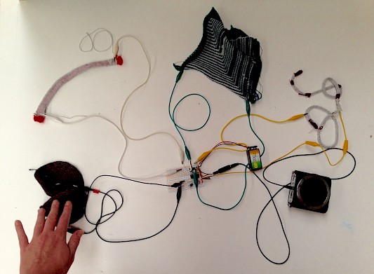 Exploration of alternative interfaces such as variable resistors (potentiometers) made here with knitting & crochet techniques to modify the pitche of oscillators.