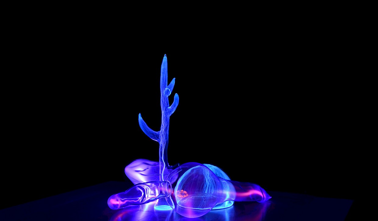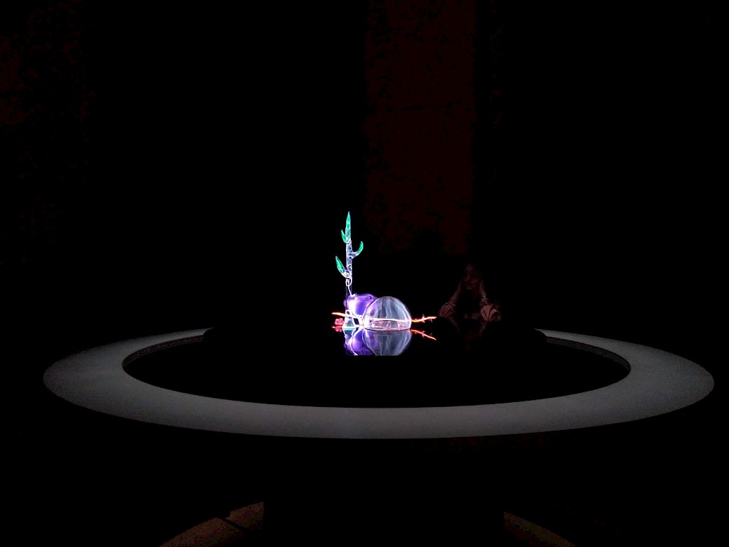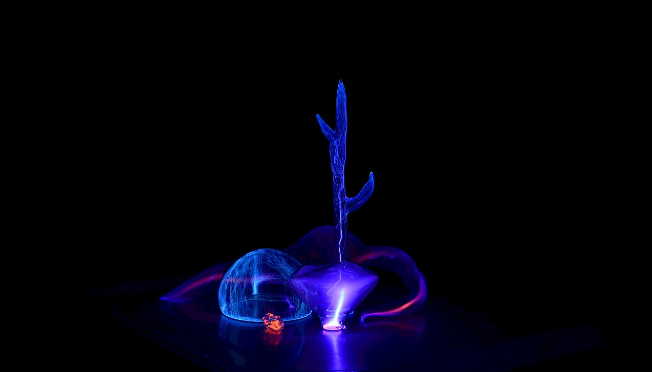 Six formes reposent au centre d’un grand disque plat. L’une rappelle les morceaux de silice amorphe produits par l’impact de la foudre sur le sable, les autres semblent pareilles à des méduses, coraux ou algues qui peupleraient des fonds marins dont on ne sait rien. Chacune d’elle est emplie d’une matière-énergie de teinte et de structure à nulle autre égale. Les six formes sont toutes différentes mais elles appartiennent sans aucun doute à la même classe d’objet, la même catégorie de choses.Aux physiciens, elles rappellent les tubes utilisés par Heinrich Geissler pour expérimenter sur le comportement de certains gaz lorsqu’ils sont traversés par des courants électriques. A ceux qui fréquentent les boutiques des musées de sciences, elles rappellent les globes luminescents qui réagissent aux toucher. Aux explorateur des hautes latitudes, elles rappellent les aurores boréales. Elles sont à la fois tout cela et rien de cela.