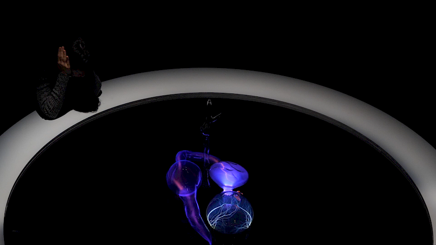 Elles sont emplies des gaz qui composent le milieu interstellaire : argon, néon, krypton, xénon, nitrogène...Elles sont tissée de la même étoffe que le soleil : le plasma. Quatrième état de la matière, le plasma compose 99 % de notre univers visible mais aucun des 100 % de celui dans lequel nous évoluons. C’est ce qui rend étrange le fait d’entendre son activité comme venant de l’intérieur de notre corps lorsque nous posons nos coudes sur l’anneau qui ceint le grand disque plat. Toute l’installation pulse au rythme de l’activité électromagnétique du soleil.