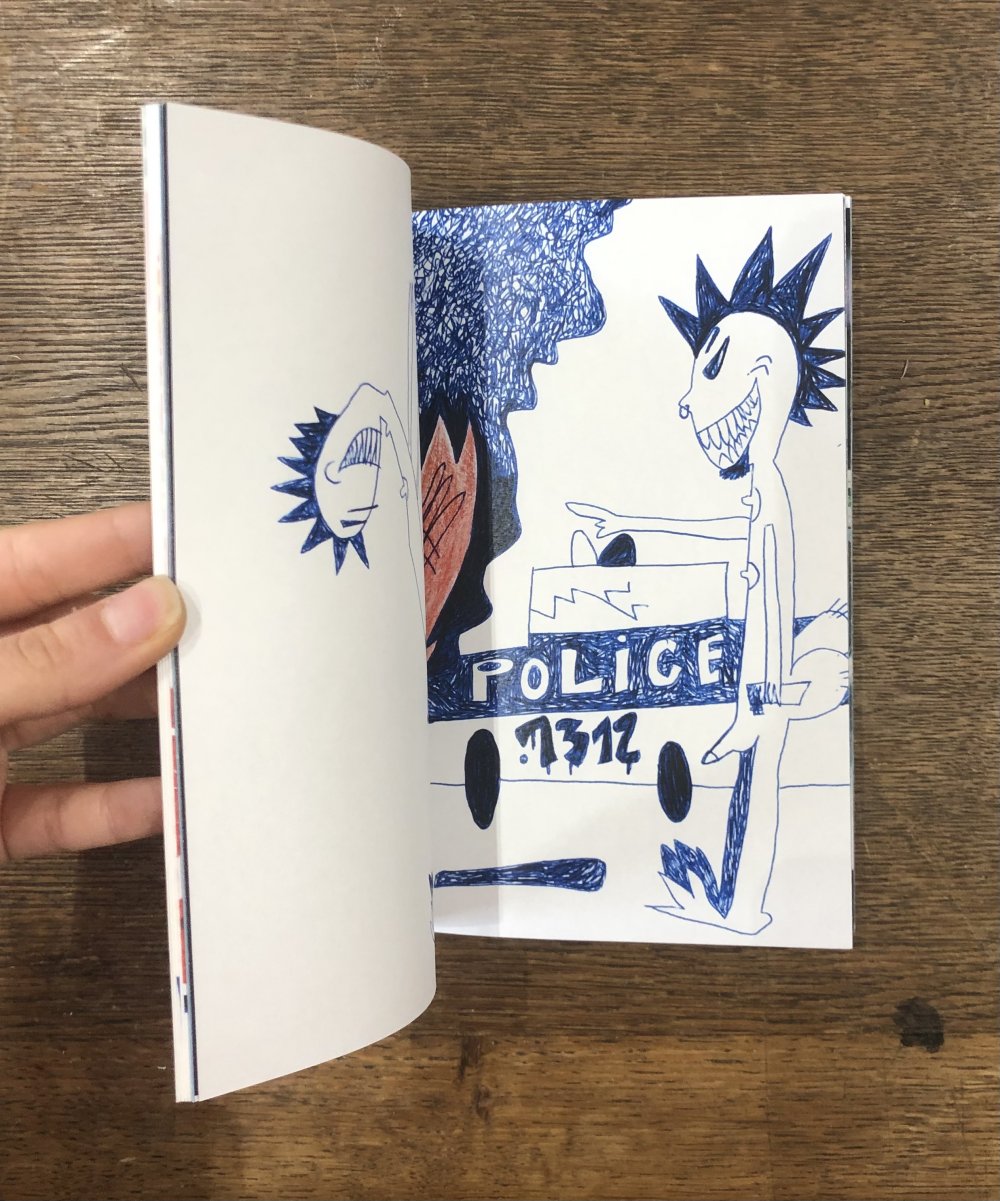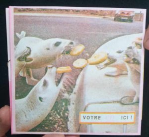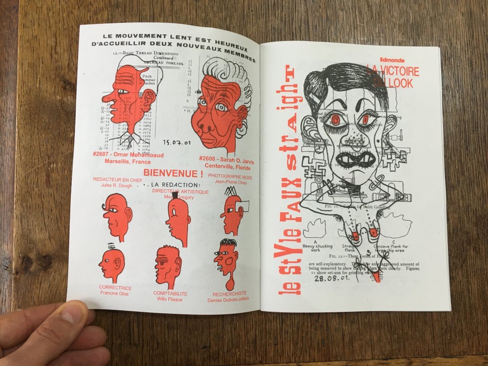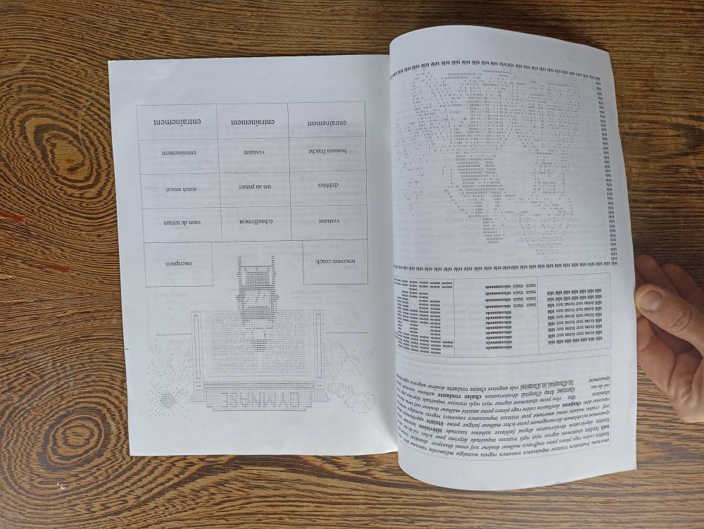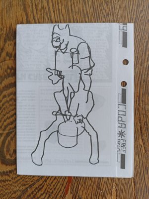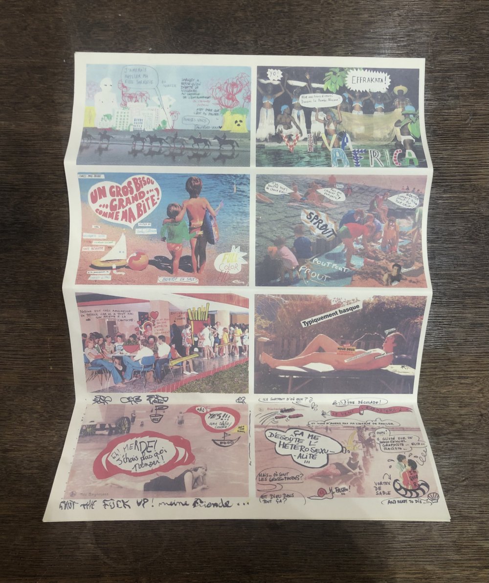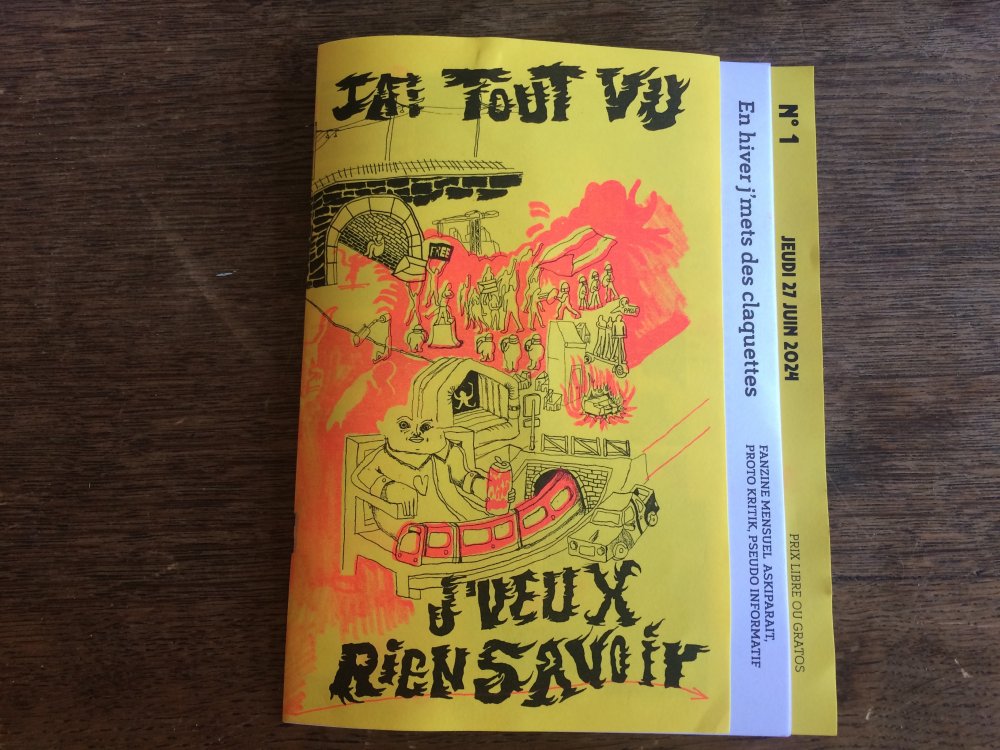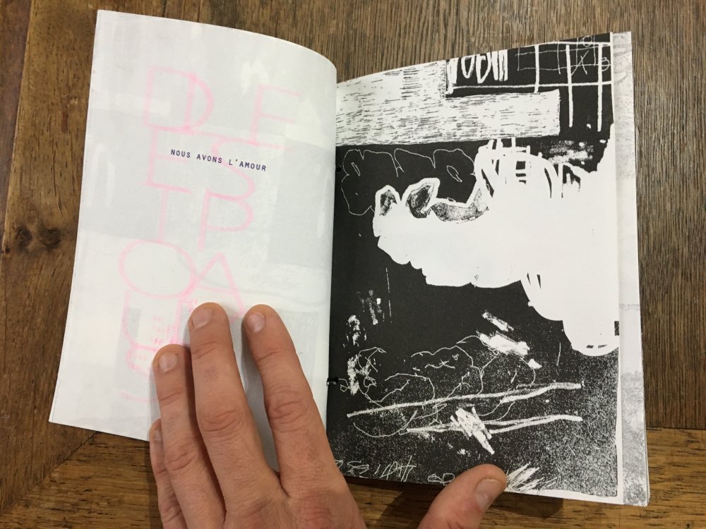 Réédition augmentée (lire modifiée) de l'édition originale de 2001, qui elle était imprimée en sérigraphie. Fanzine de 16 pages format A5 en (riso) 2 couleurs. Dessins accompagnés de textes composés avec des mots découpés dans des magazines.