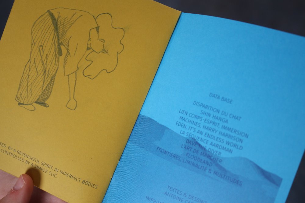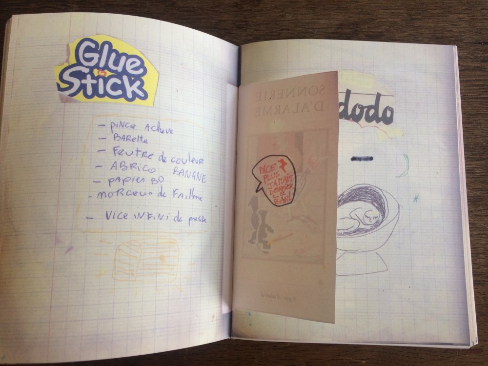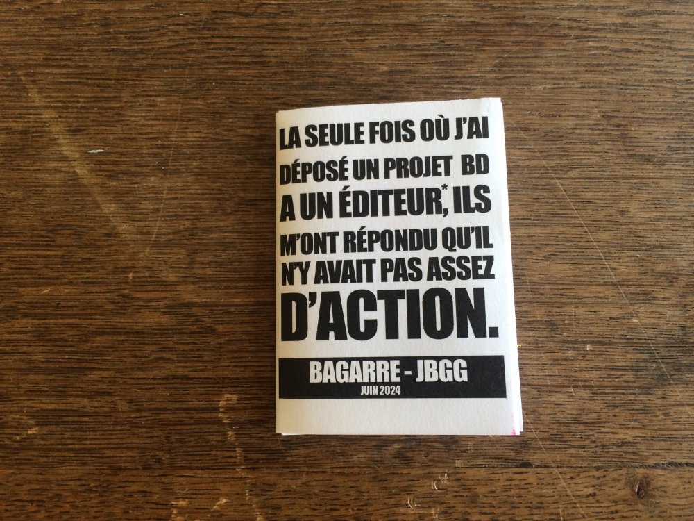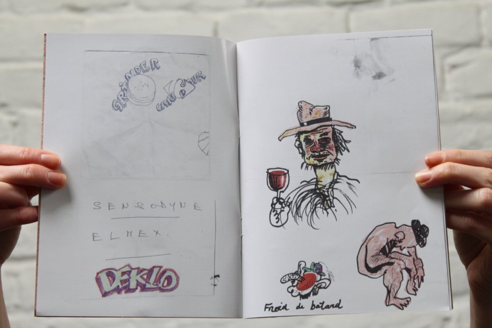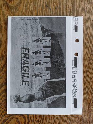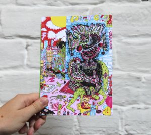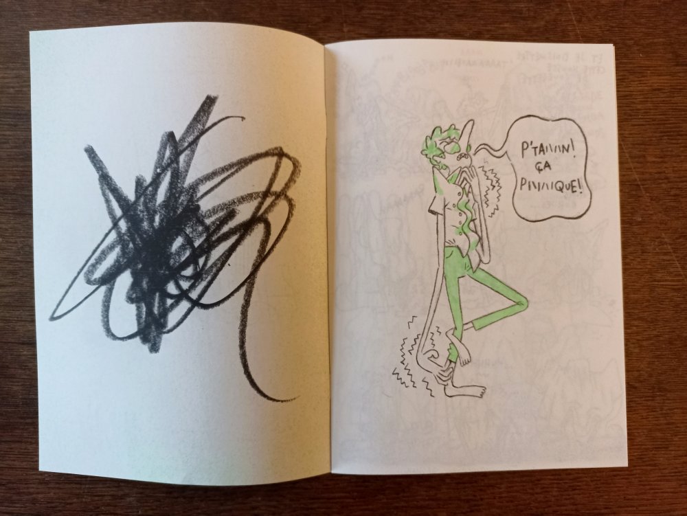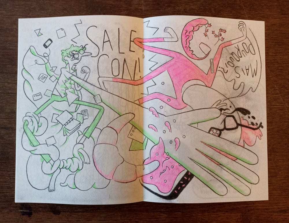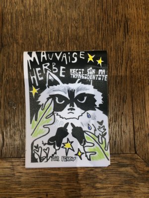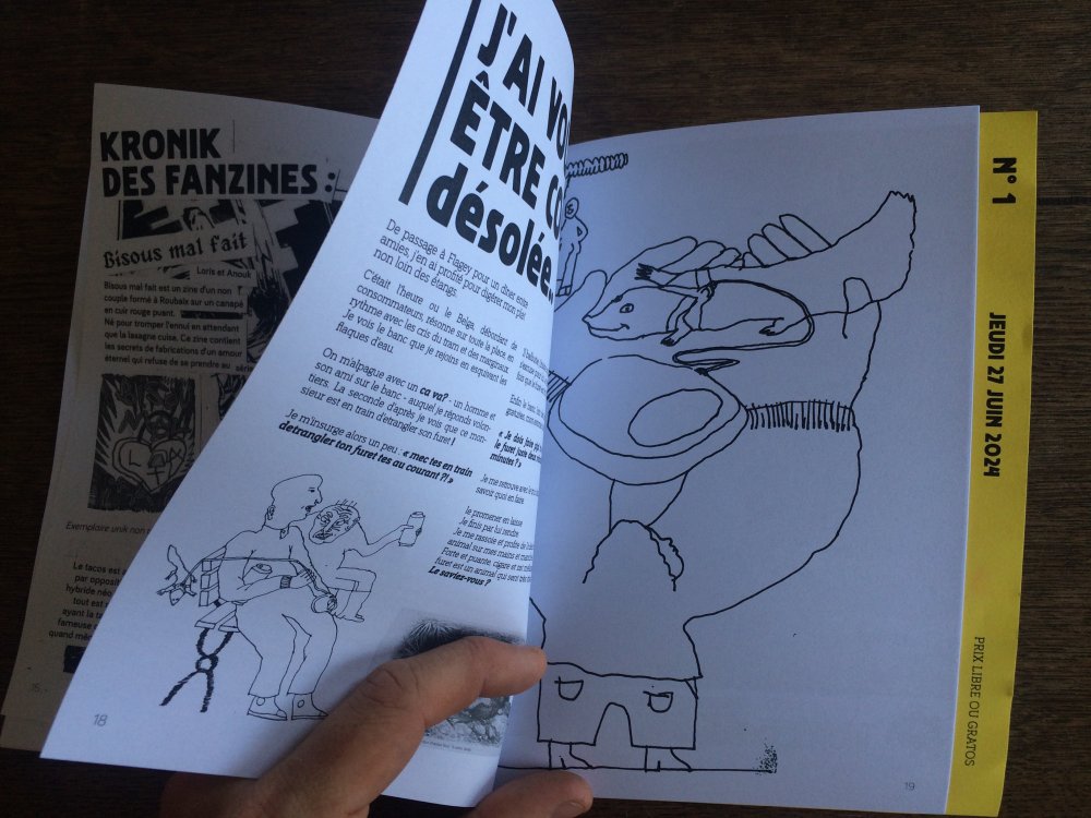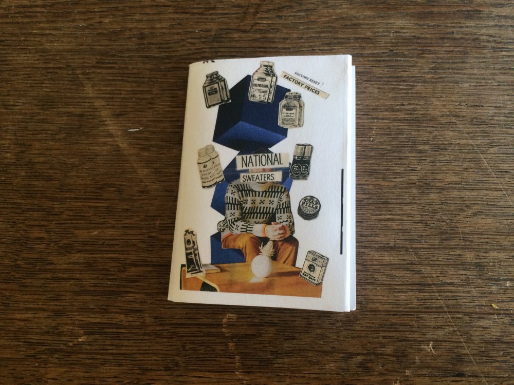 Réédition augmentée (lire modifiée) de l'édition originale de 2001, qui elle était imprimée en sérigraphie. Fanzine de 16 pages format A5 en (riso) 2 couleurs. Dessins accompagnés de textes composés avec des mots découpés dans des magazines.