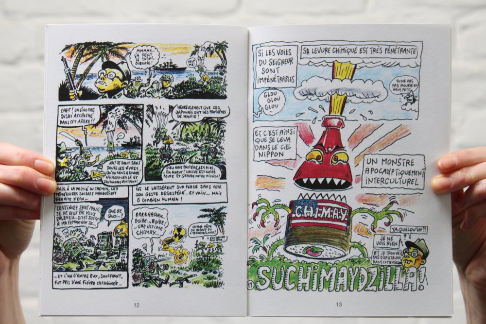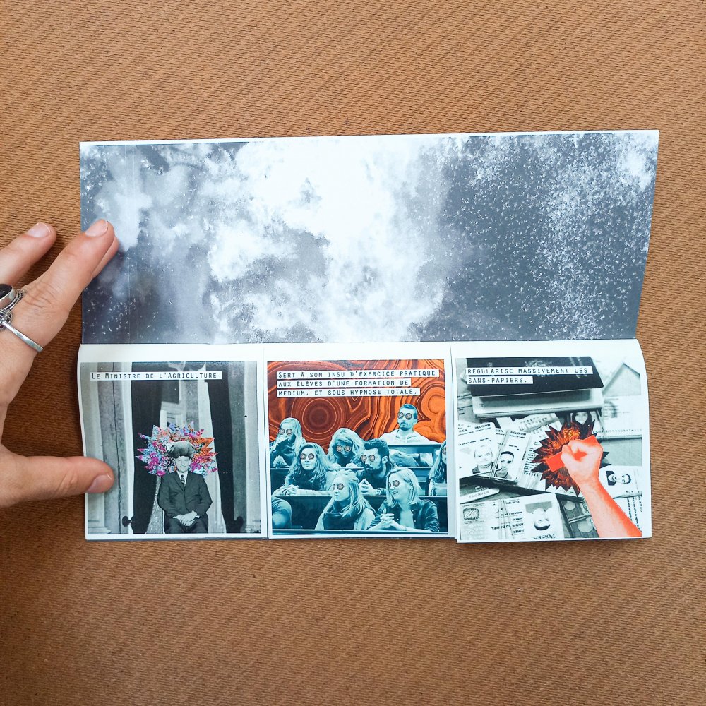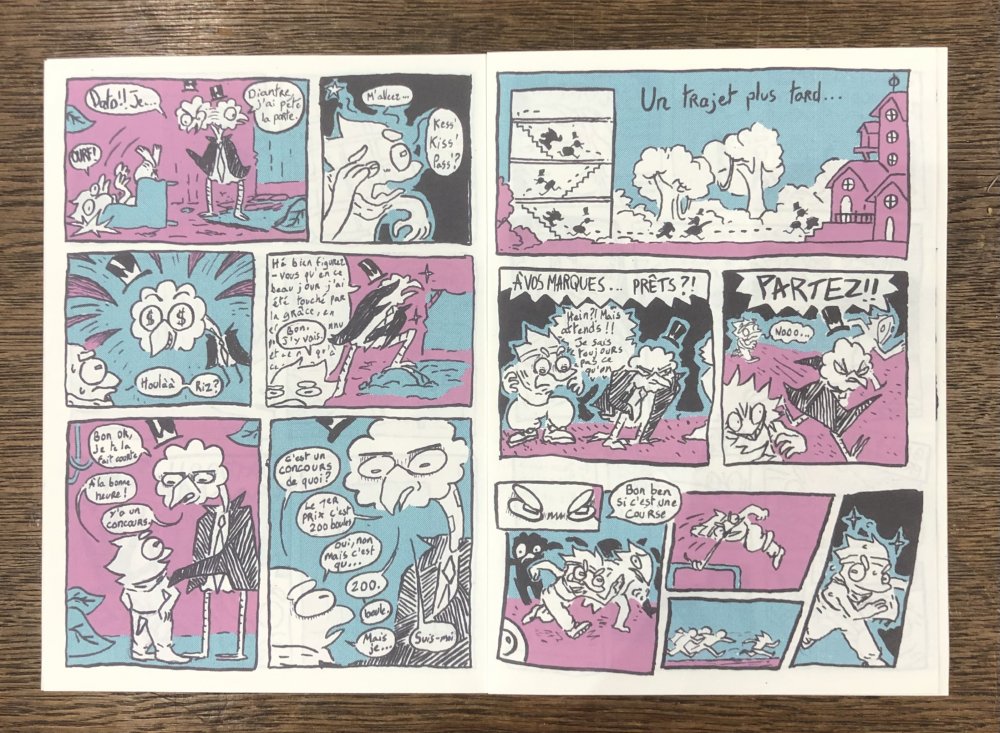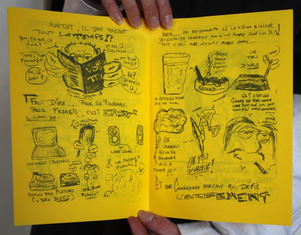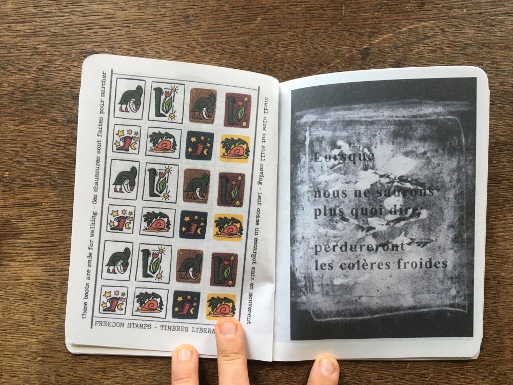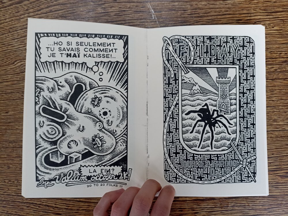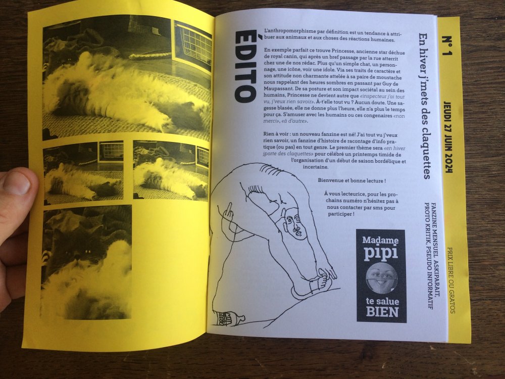 Réédition augmentée (lire modifiée) de l'édition originale de 2001, qui elle était imprimée en sérigraphie. Fanzine de 16 pages format A5 en (riso) 2 couleurs. Dessins accompagnés de textes composés avec des mots découpés dans des magazines.
