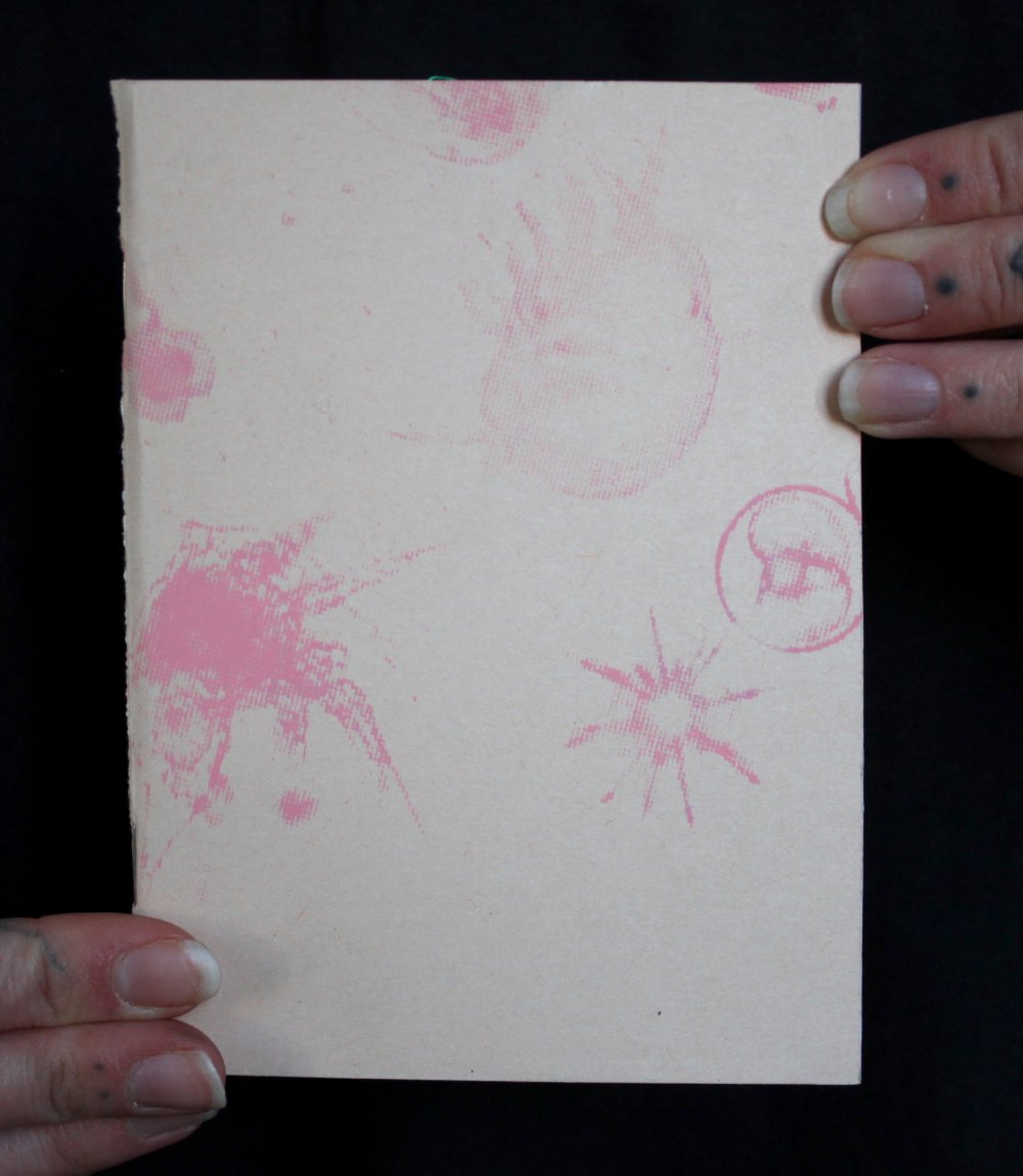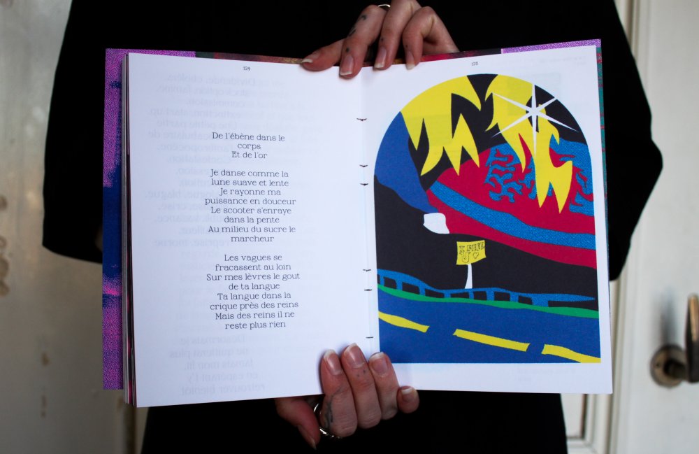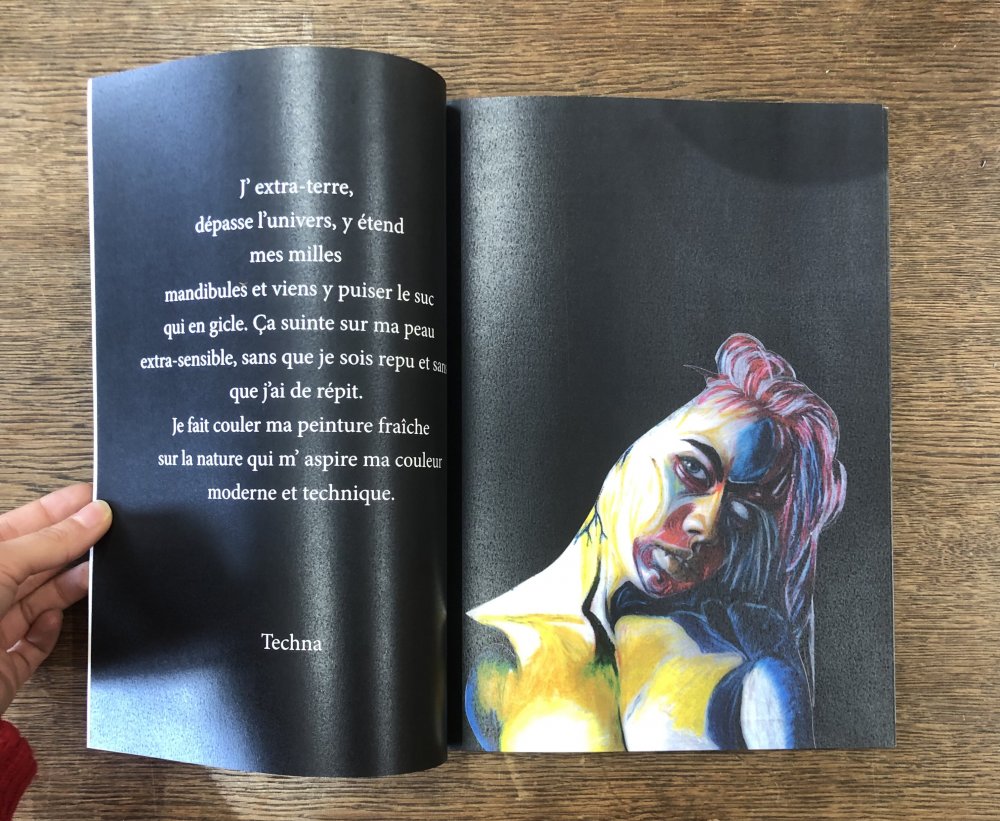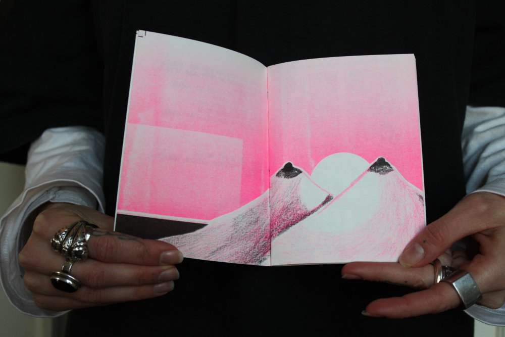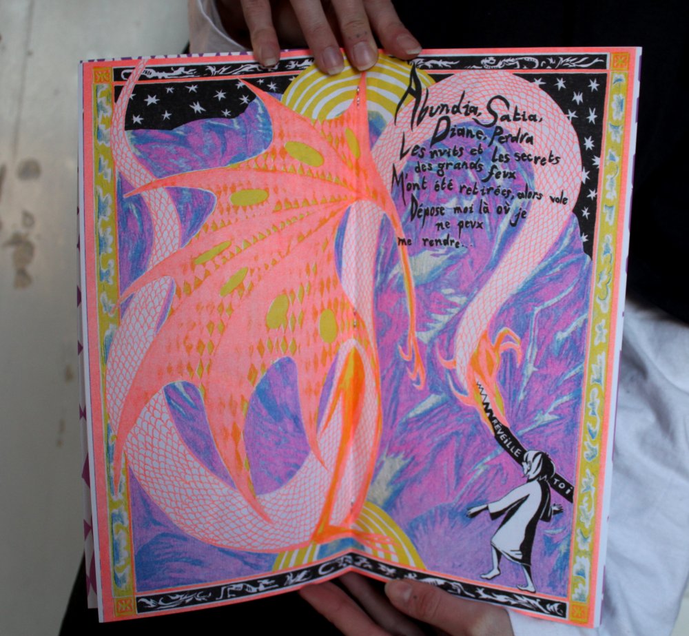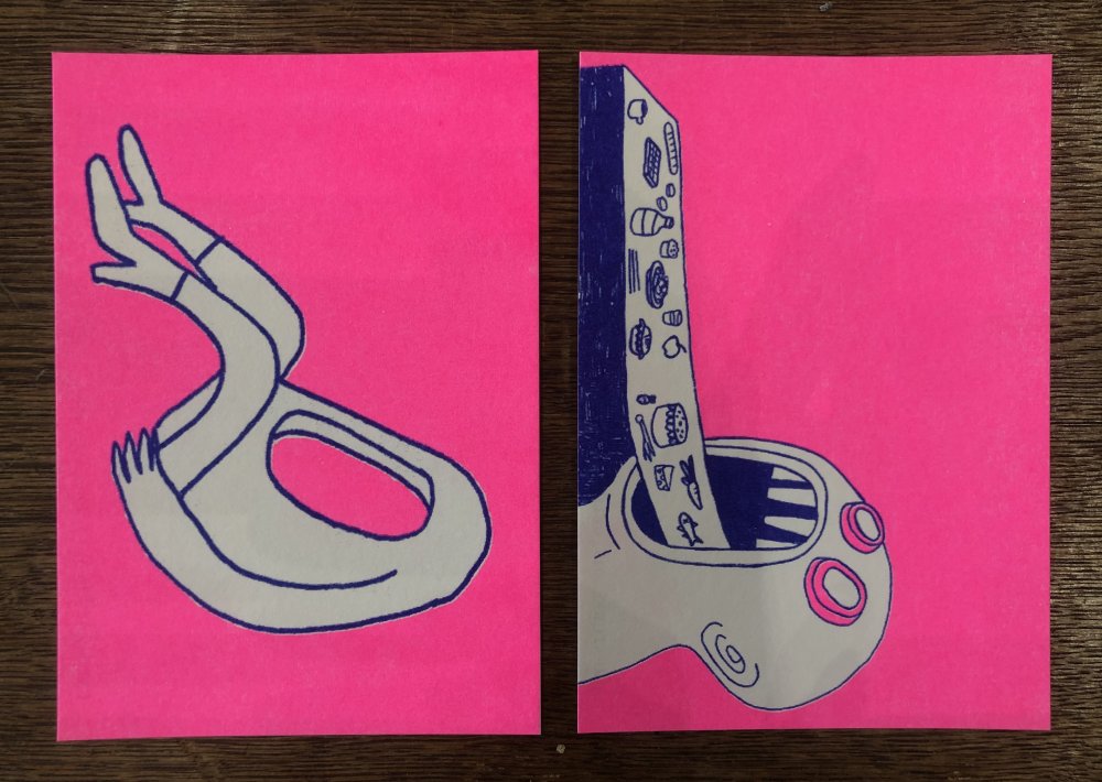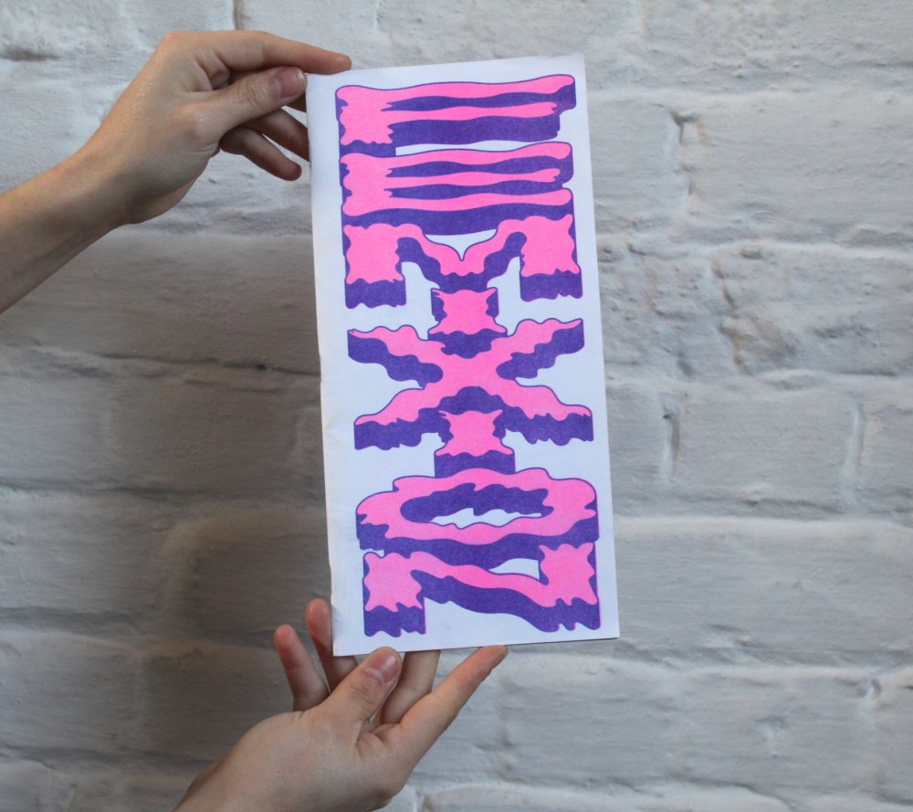 Fanzine de poésie et d'illustrations, format A5, riso 3 couleurs noir, rose, violet.