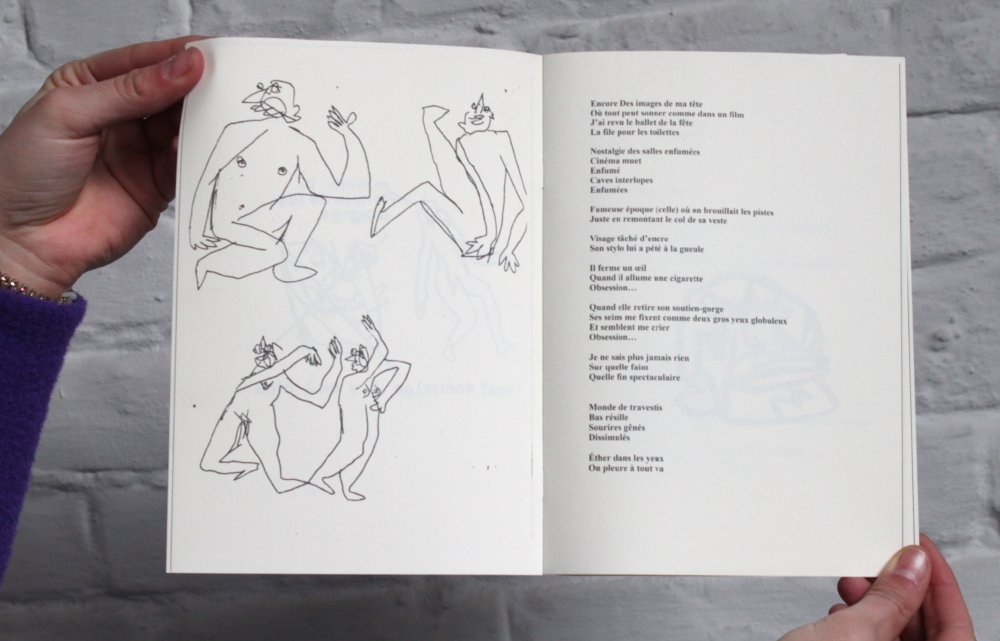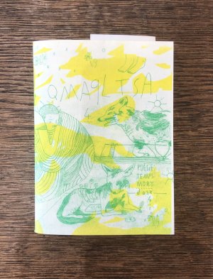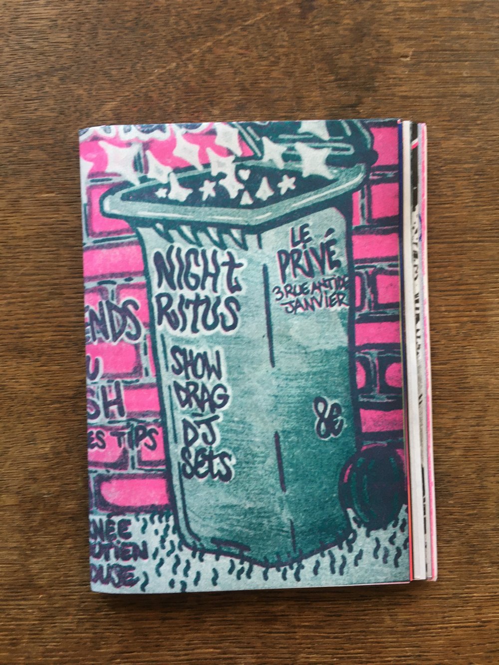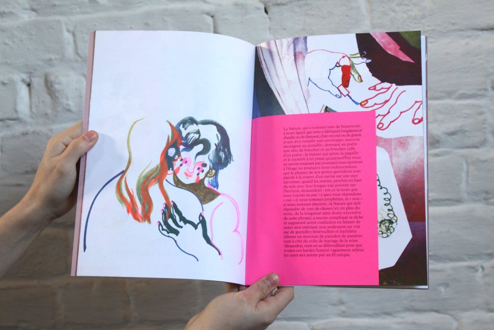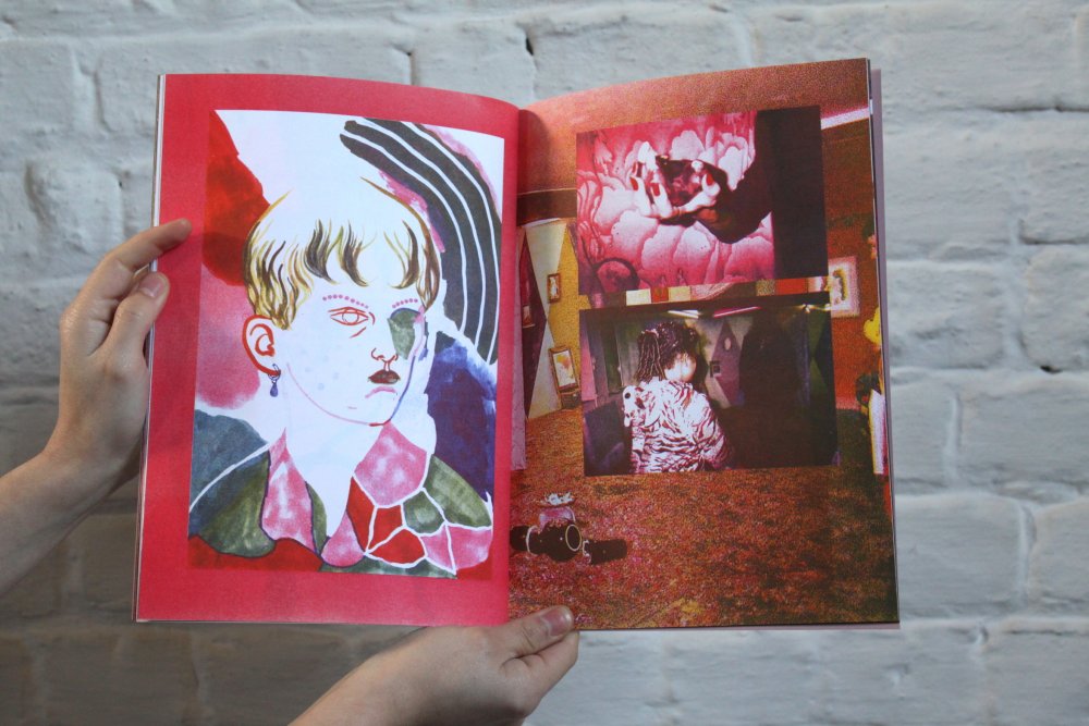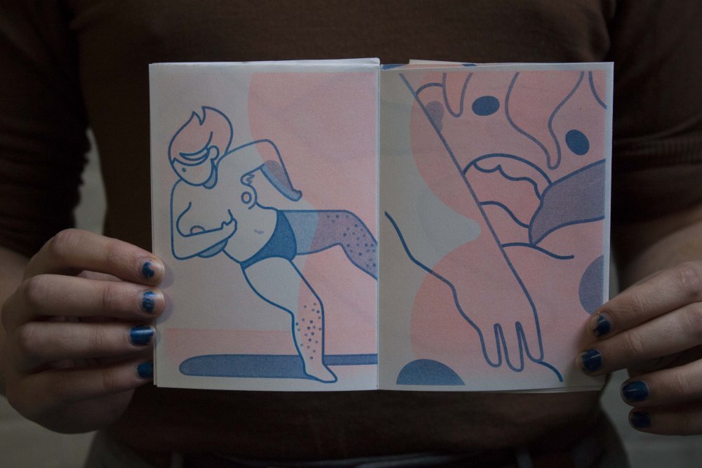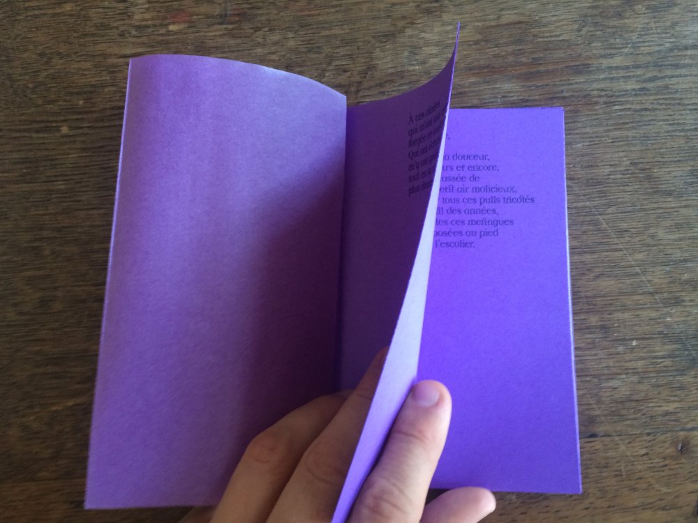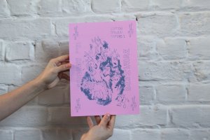 Fanzine de poésie et d'illustrations, format A5, riso 3 couleurs noir, rose, violet.