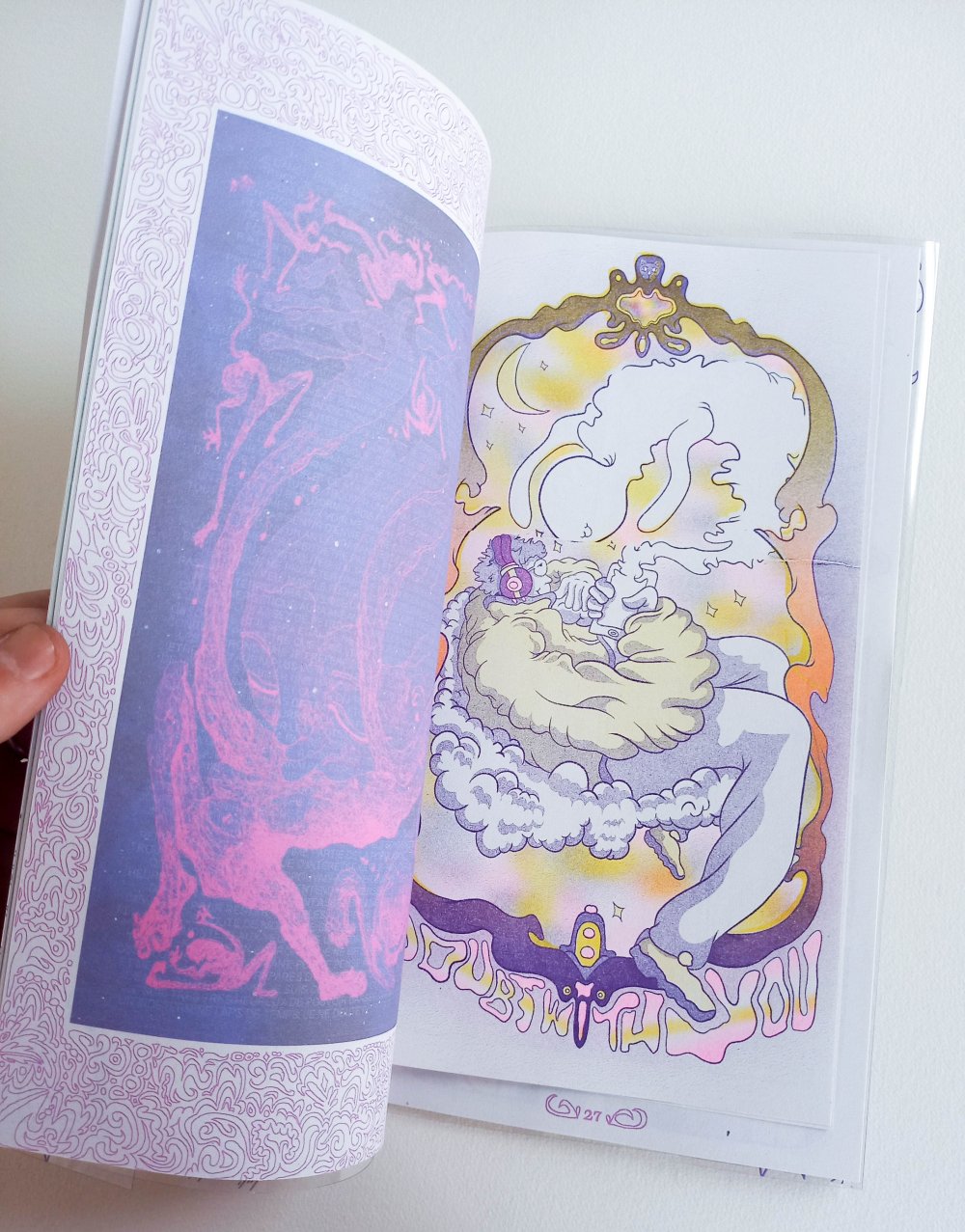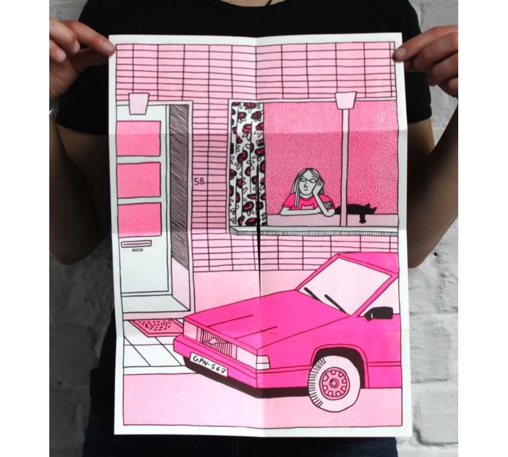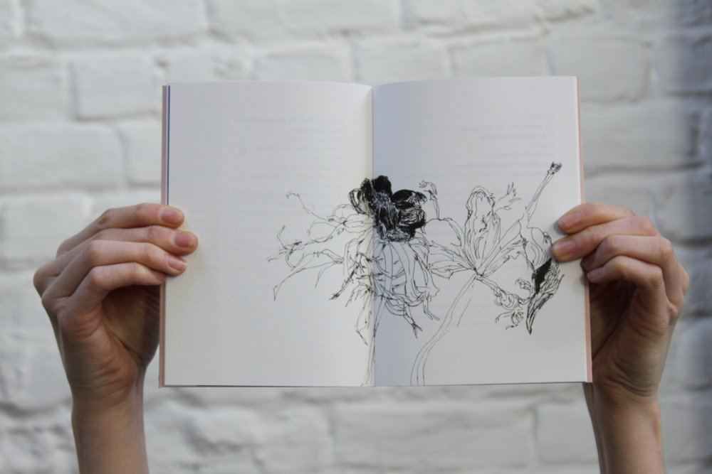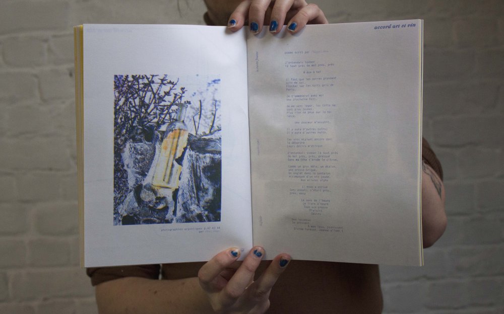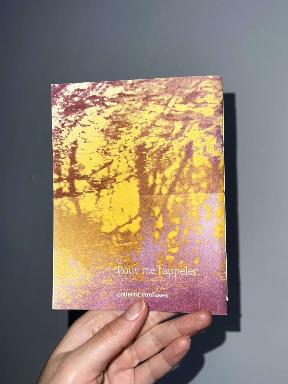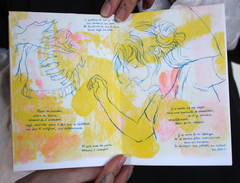 Fanzine de poésie et d'illustrations, format A5, riso 3 couleurs noir, rose, violet.