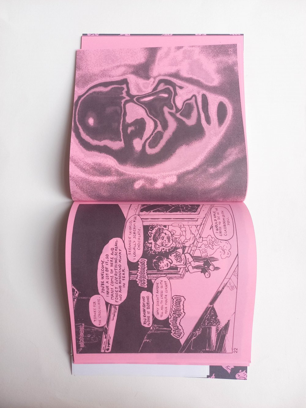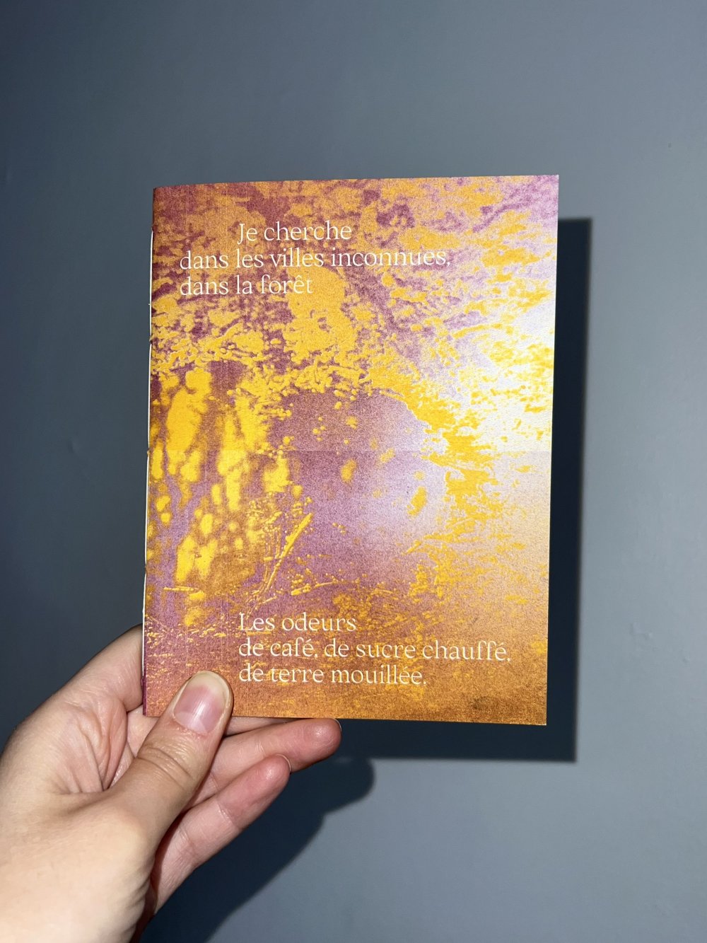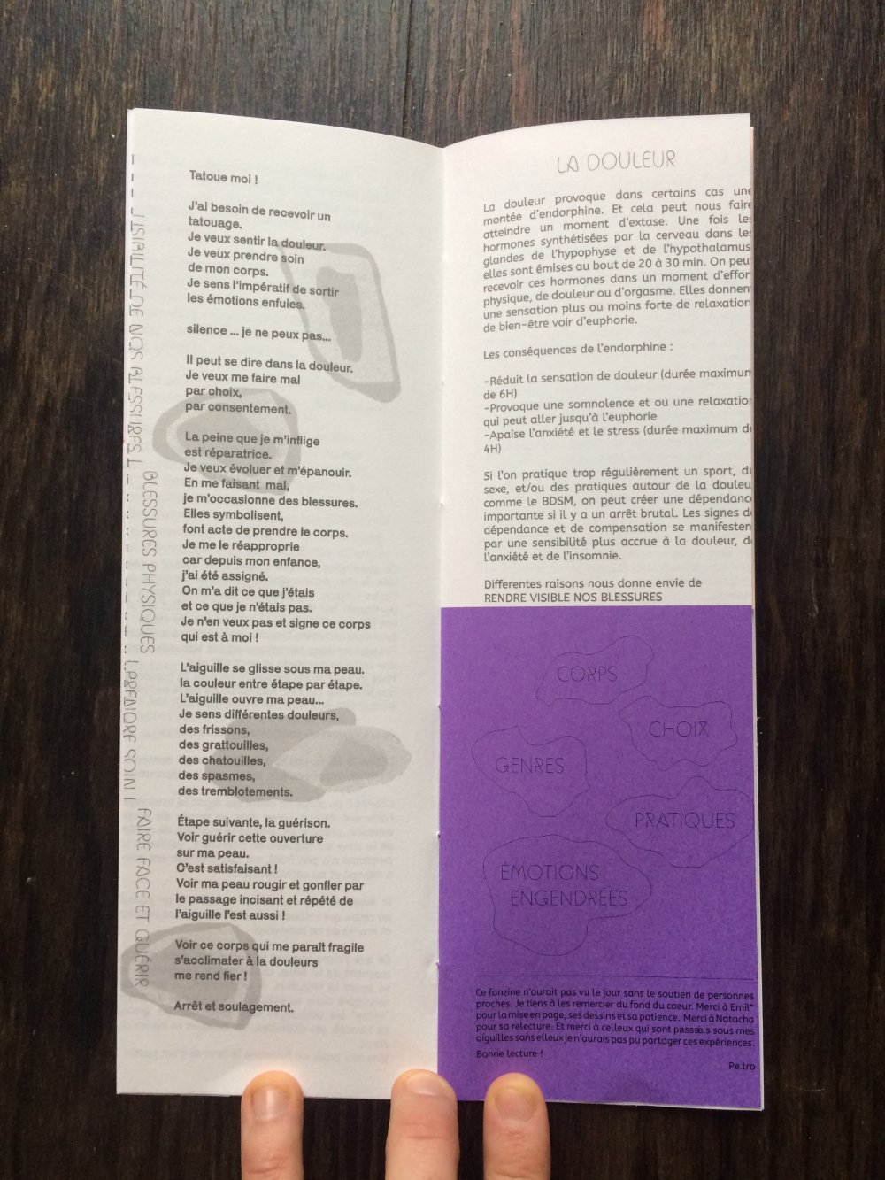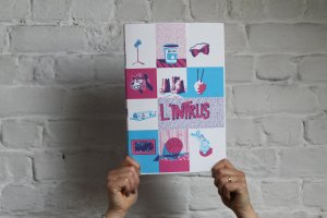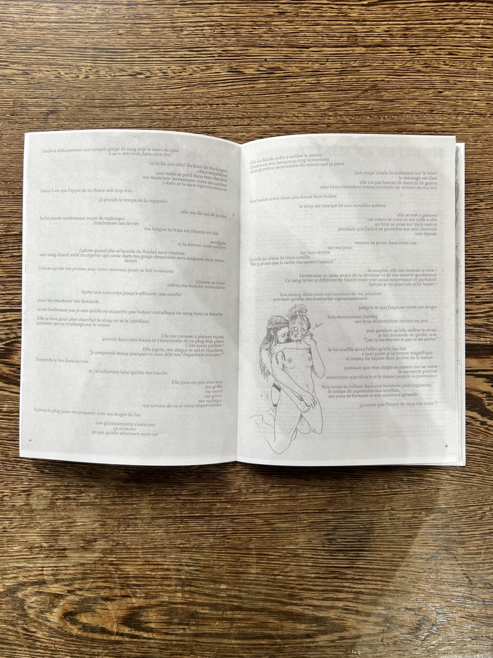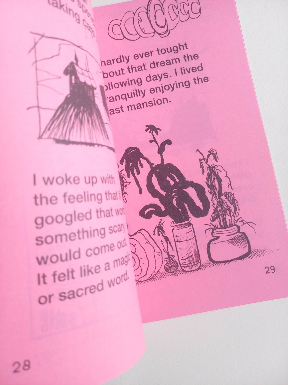 Fanzine de poésie et d'illustrations, format A5, riso 3 couleurs noir, rose, violet.
