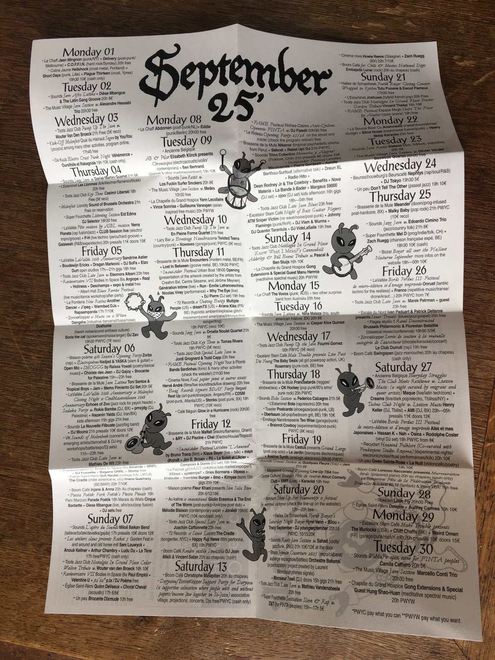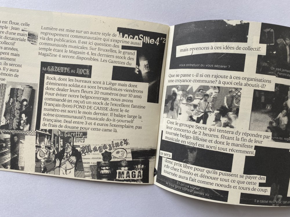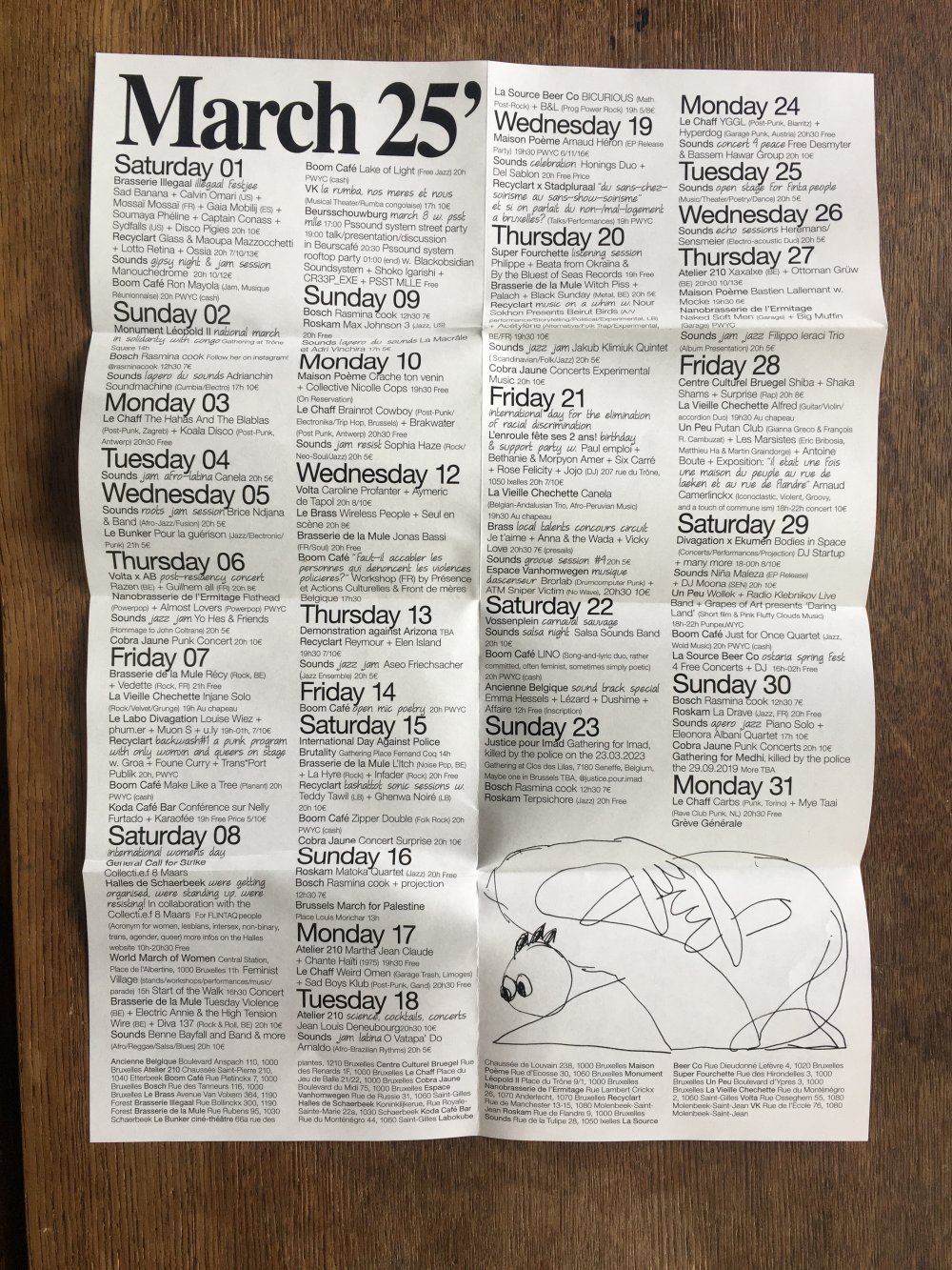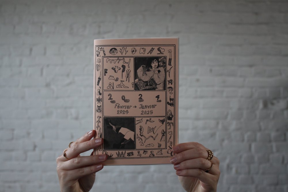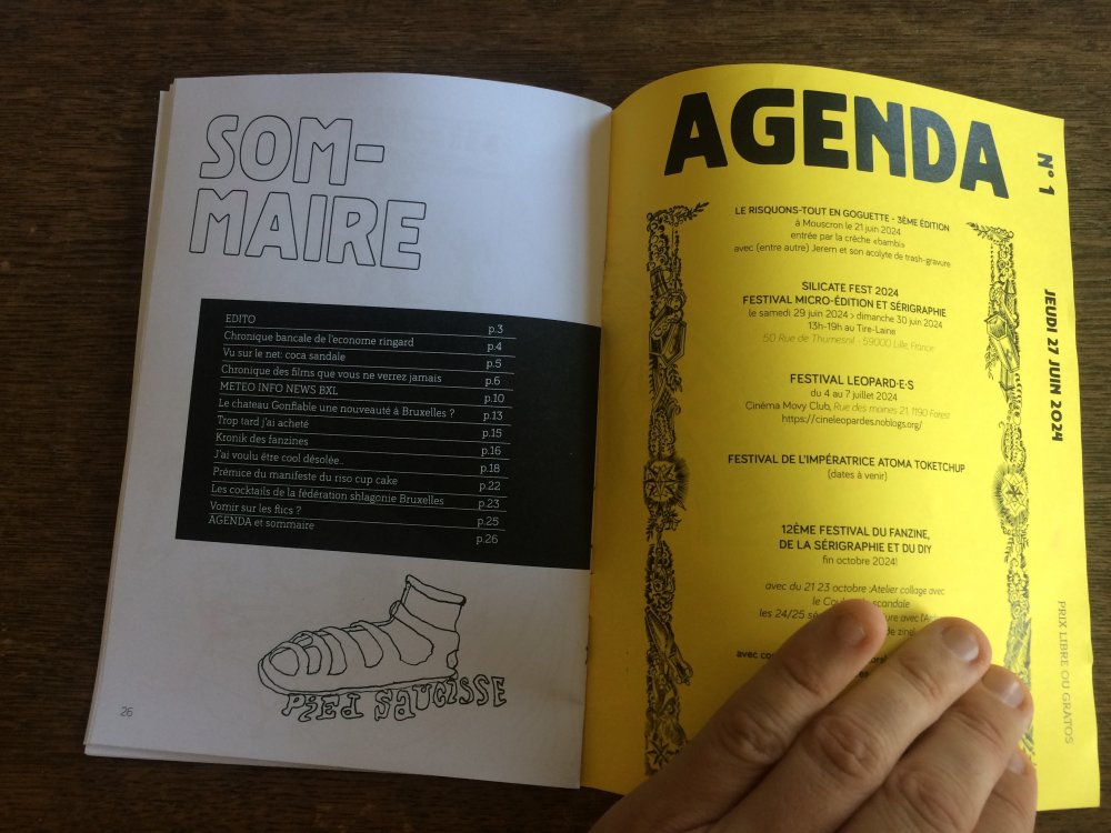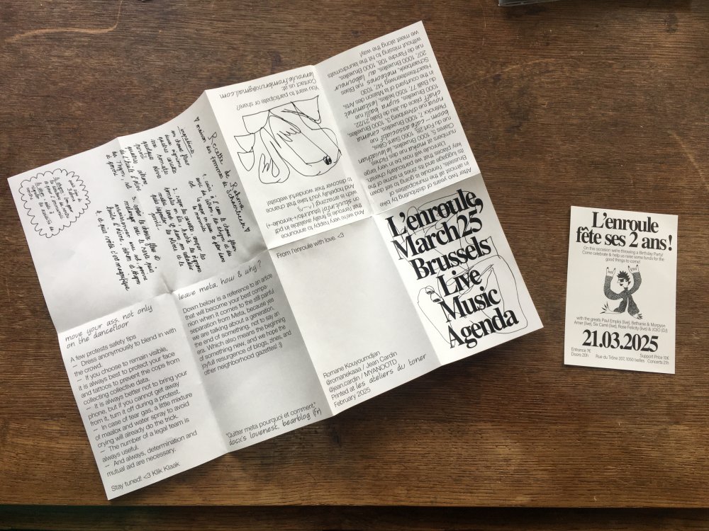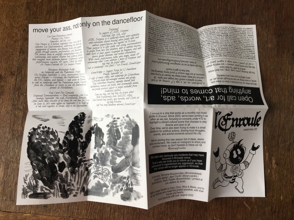 L'enroule est un agenda mensuel de musique live et de luttes à bruxelles, since 2023, A3 recto verso plié en 3 pour donner un petit fanzine A6. impression laser noir et blanc.