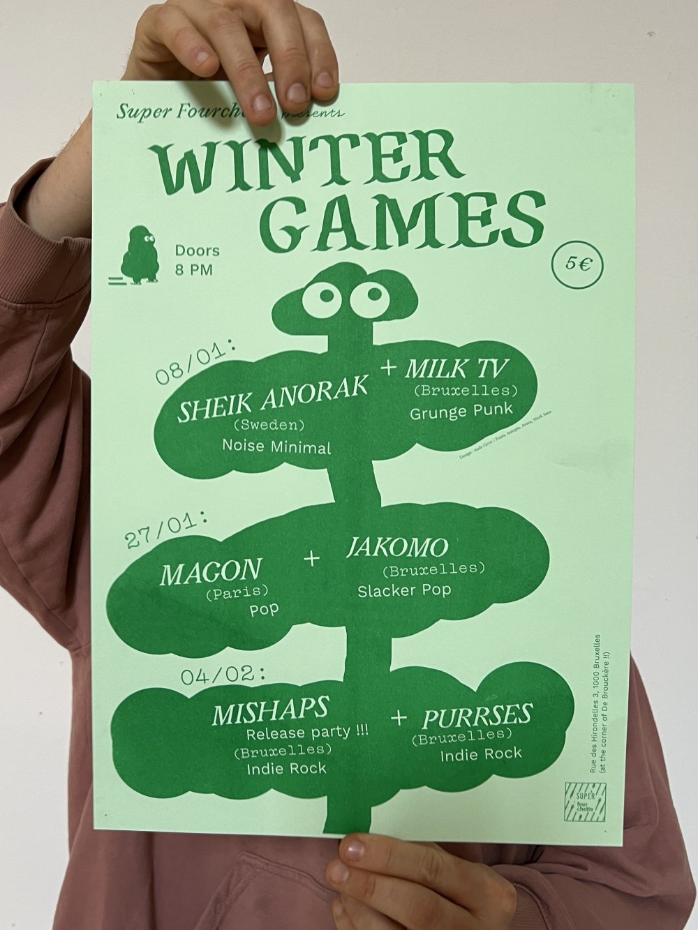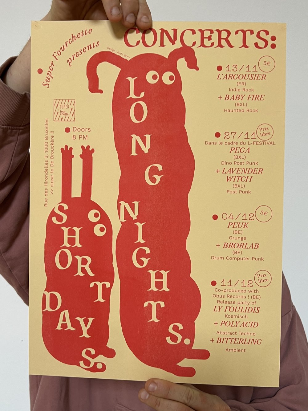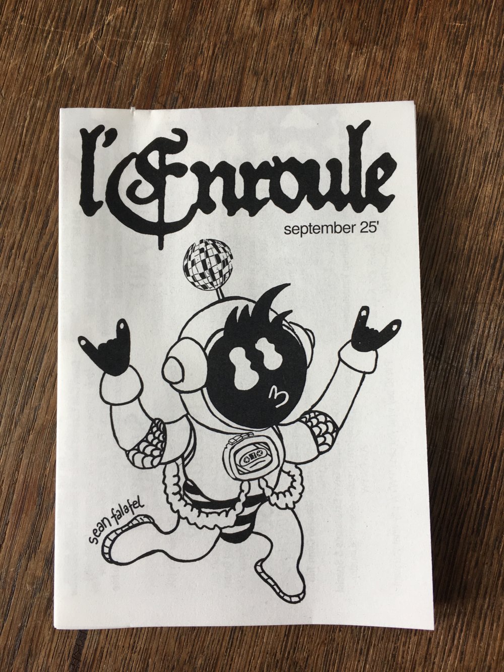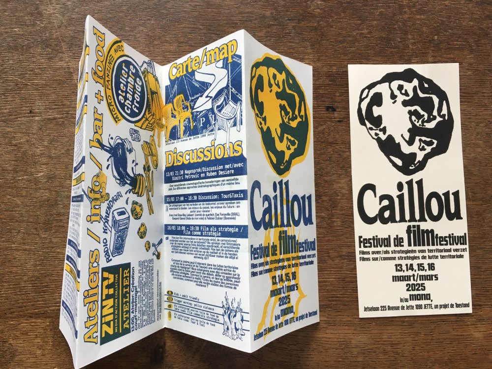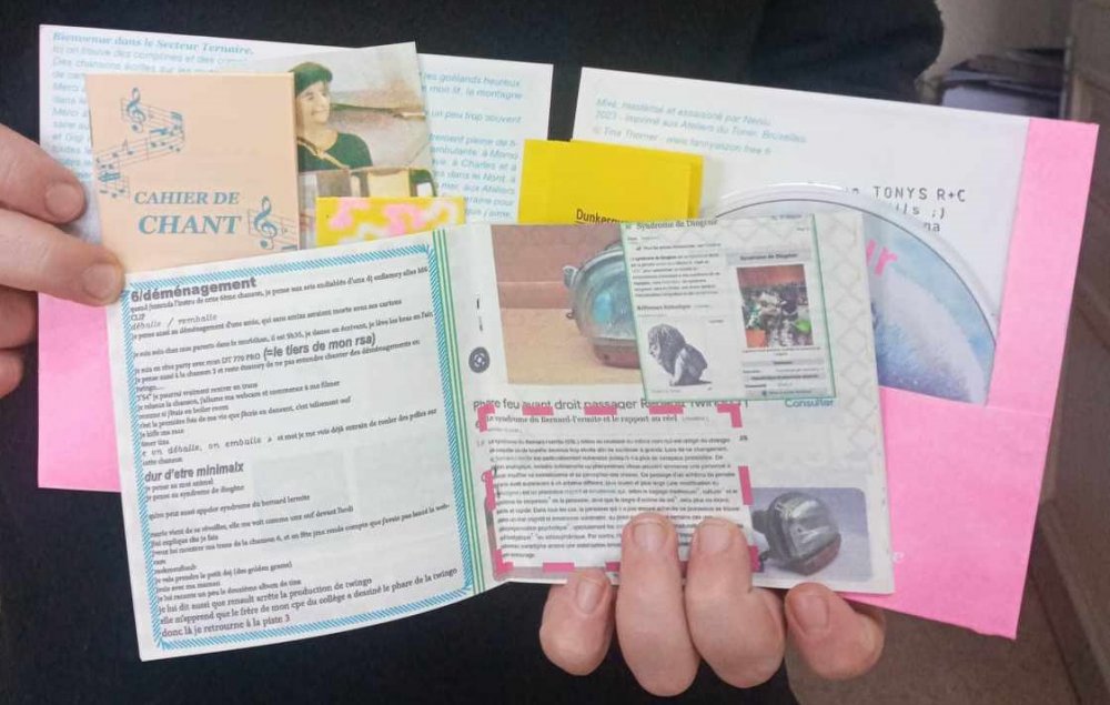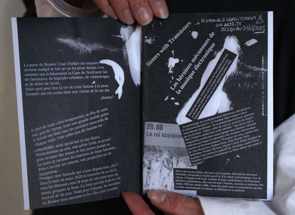 L'enroule est un agenda mensuel de musique live et de luttes à bruxelles, since 2023, A3 recto verso plié en 3 pour donner un petit fanzine A6. impression laser noir et blanc.