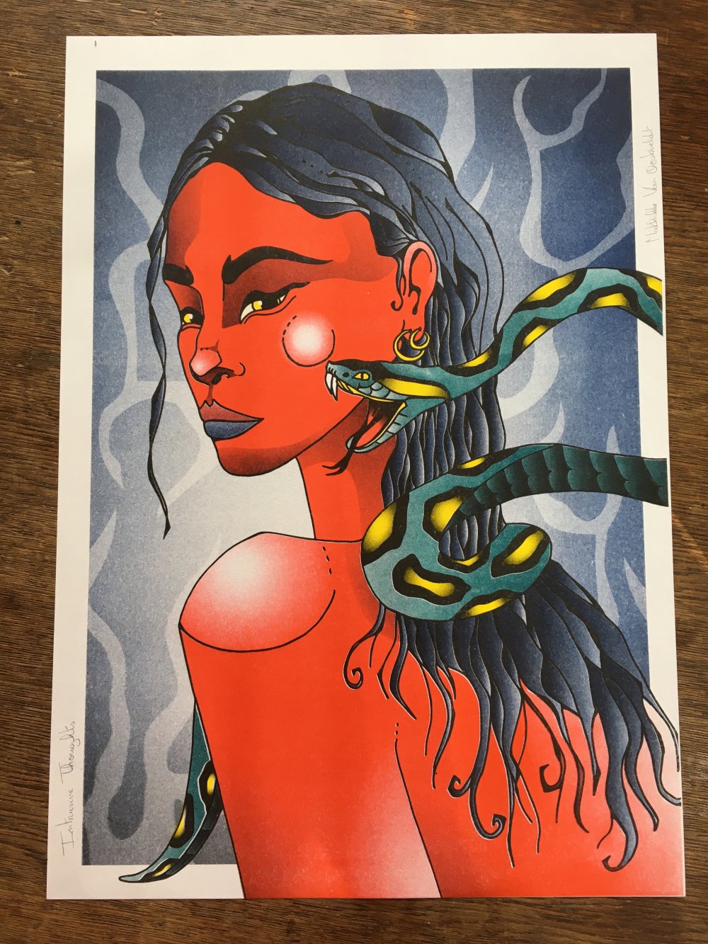 Fille rouge avec serpent sur son épaule.