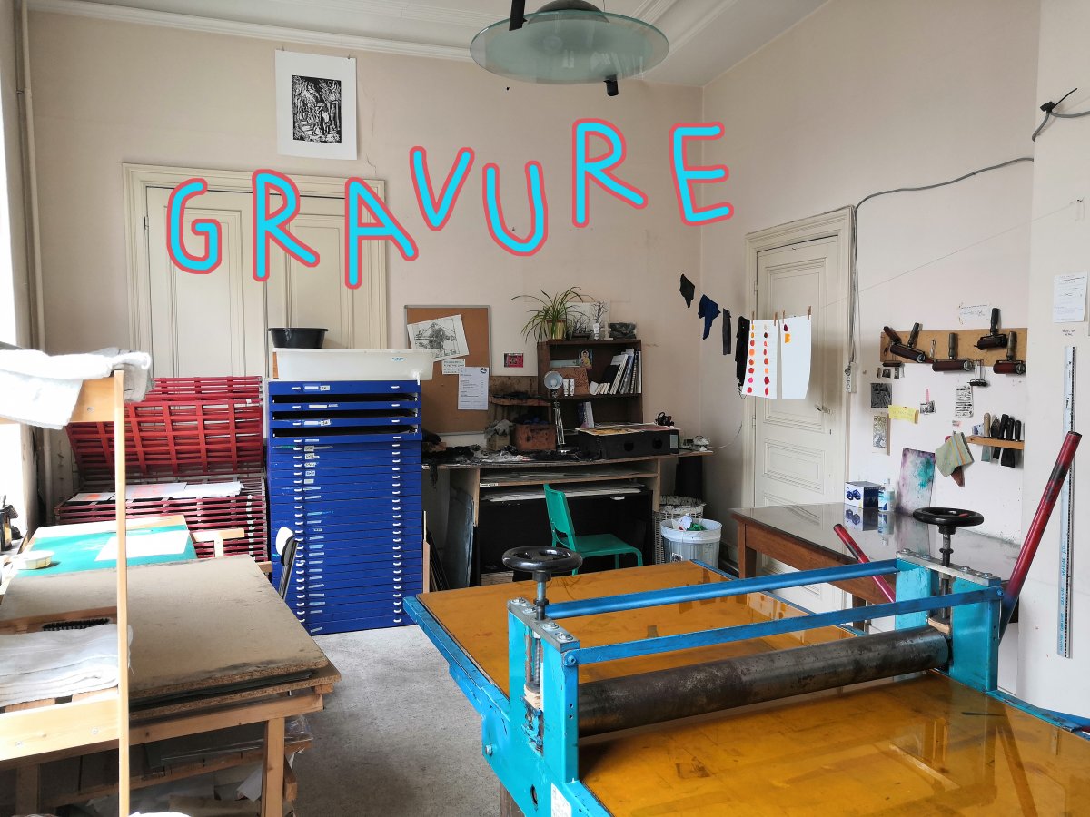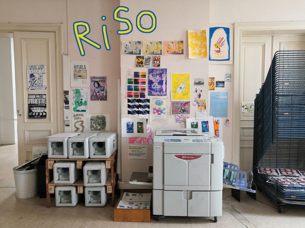 ⚡️ Matériel à disposition : Imprimantes Laser / ComColor / Riso (11 couleurs) / Atelier de gravure / Outils de façonnage et de reliure.