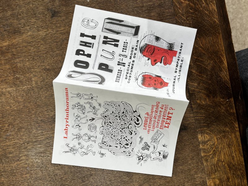 Elle nous a pris au pied de la lettre en nous ramenant "SOPHIE PUNT n°3", un fanzine imprimée par elle-même en sérigraphie deux couleurs en 2001 sur papier journal, avec comme ambition de le rééditer chez nous.