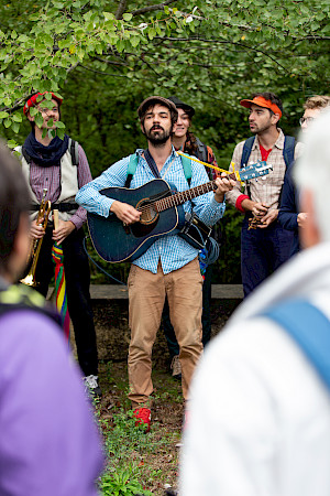 En 2017, à l’occasion de l’Été Métropolitain, nous avons imaginé le spectacle Balade Sauvage, qui consistait en une marche artistique entre les refuges périurbains du nuage de Lormont et de la nuit Américaine de Bassens. Cette belle occasion nous ayant stimulé, nous avons donc répondu avec enthousiasme à l’appel de la métropole dans le cadre de l’inauguration du premier sentier de Grande Randonnée Métropolitain, où nous y avions proposé des mini-spectacles originaux créés in-situ. Depuis, nous nous sommes associés à l’équipe du Slowfest, et produisons ensemble différentes balades artistiques nous permettant de créer des objets artistiques originaux, dans des cadres inhabituels. Impromptus musicaux, dansés, et amplifiés grâce aux remorques solaires du Slowfest, ces balades invitent à découvrir de nouveaux parcours de marche, créer des rencontres entre les marcheurs festoyeurs. Désormais, nous avons aussi la possibilité d'accueillir de nouveaux artistes dans une programmation éclectique, et continuons notre exploration de nouveaux territoires.