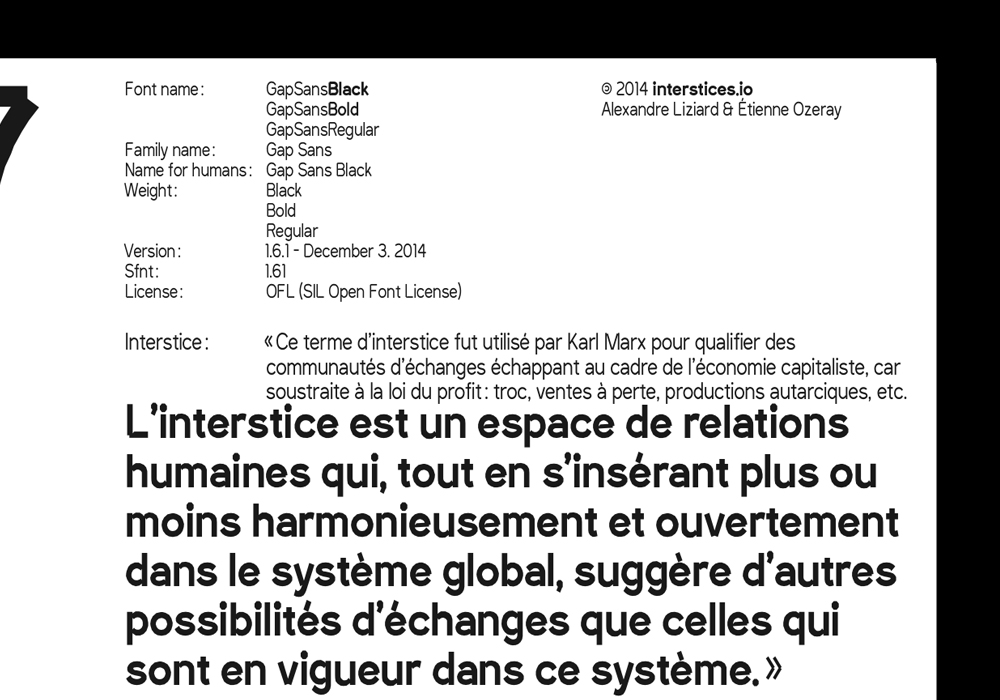 La Gap Sans est une sans sérif basé sur le dessin de la Sani Trixie San dessiné par "Grand chaos 9000". Elle a été dessinée dans le cadre du projet de diplôme de l'ÉnsAD en collaboration avec Étienne Ozeray, pour la plateforme interstices.io. « Ce terme d’interstice fut utilisé par Karl Marx pour qualifier des communautés d’échanges échappant au cadre de l’économie capitaliste, car soustraite à la loi du profit : troc, ventes à perte, productions autarciques, etc. L’interstice est un espace de relations humaines qui, tout en s’insérant plus ou moins harmonieusement et ouvertement dans le système global, suggère d’autres possibilités d’échanges que celles qui sont en vigueur dans ce système. »