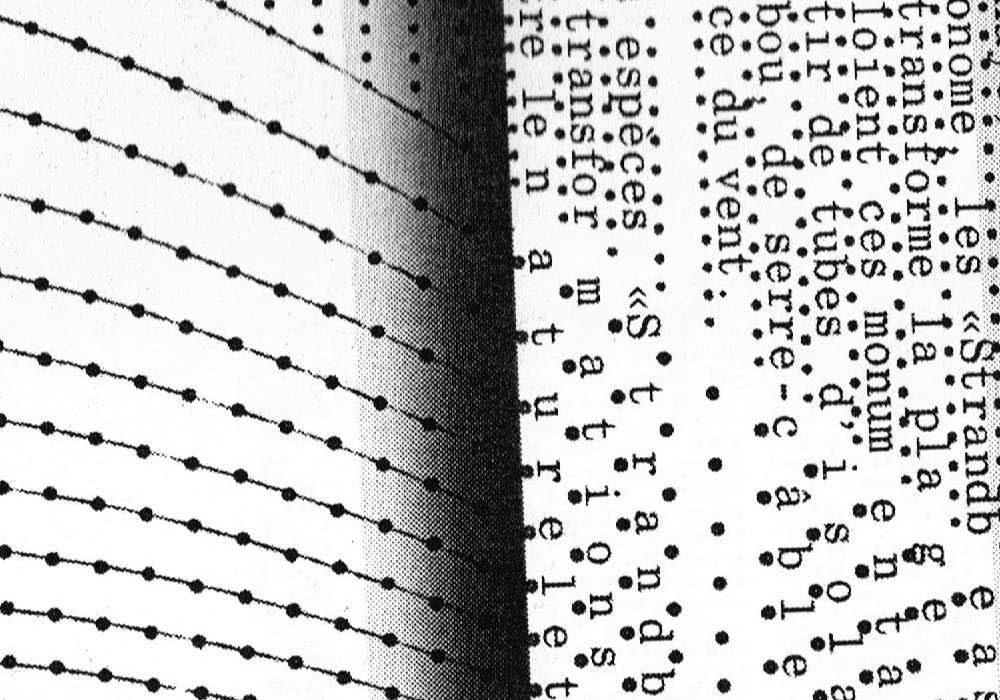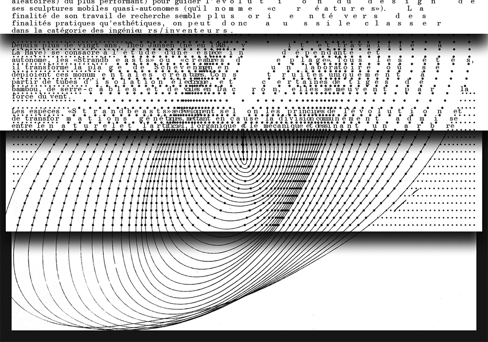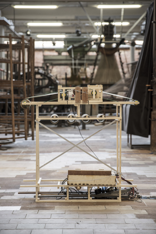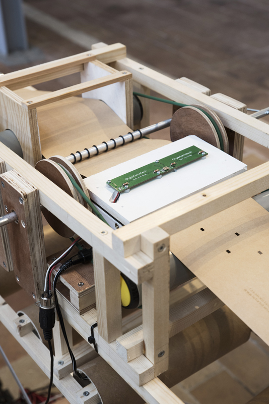 « Ce projet est inspiré des liens intimes que les langages textiles, informatiques et musicaux entretiennent. Au 18ème siècle, les systèmes de cartes perforés utilisés par les orgues de barbaries et les métiers jacquards ont inspirés la base de nos systèmes informatiques. Cette installation sonore, électro mécanique interprète une partition de cartes perforés, mêlant sons acoustiques et motifs. Les visiteurs pourront ainsi remixer cette partition rendant audible les rythmes des motifs à travers les éléments de l’architecture. »