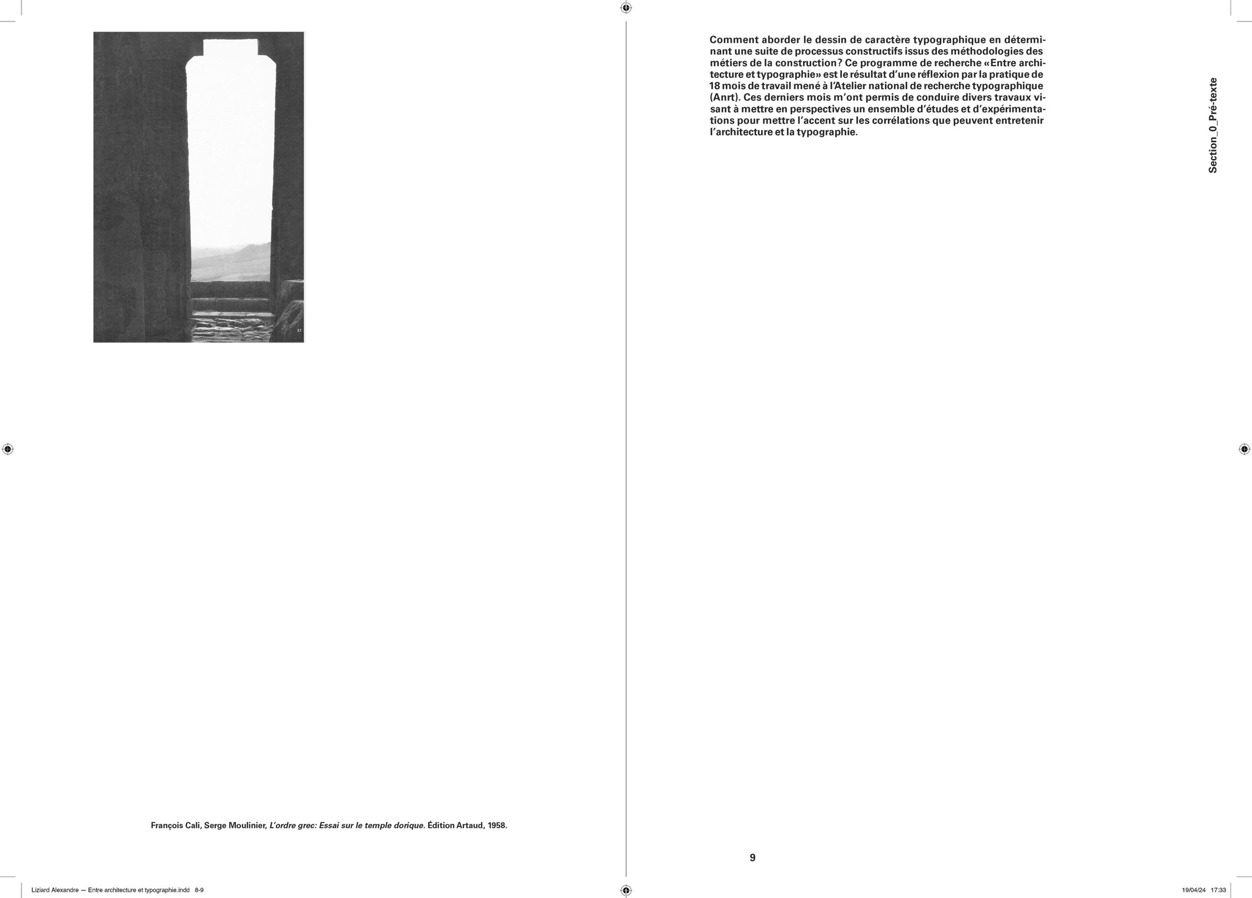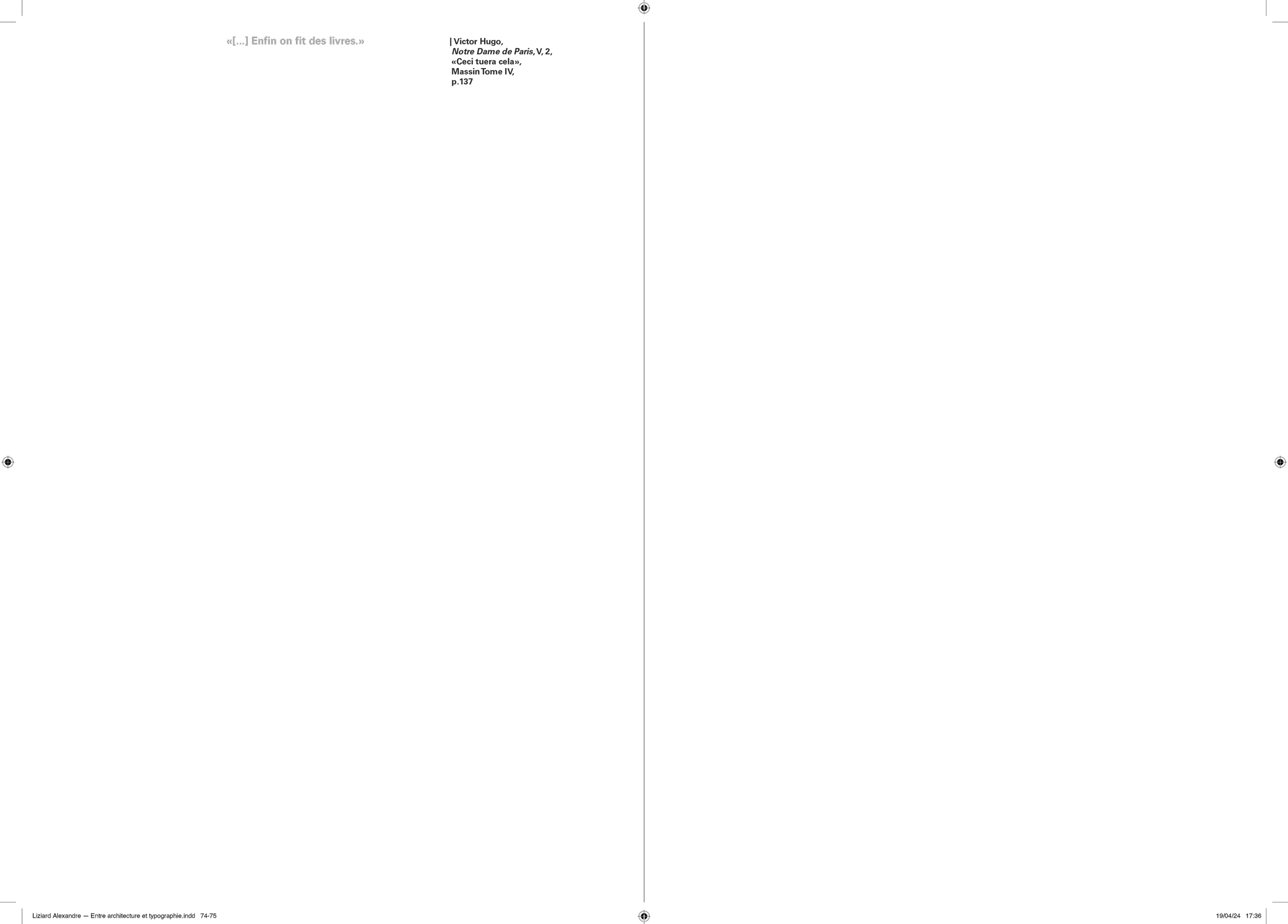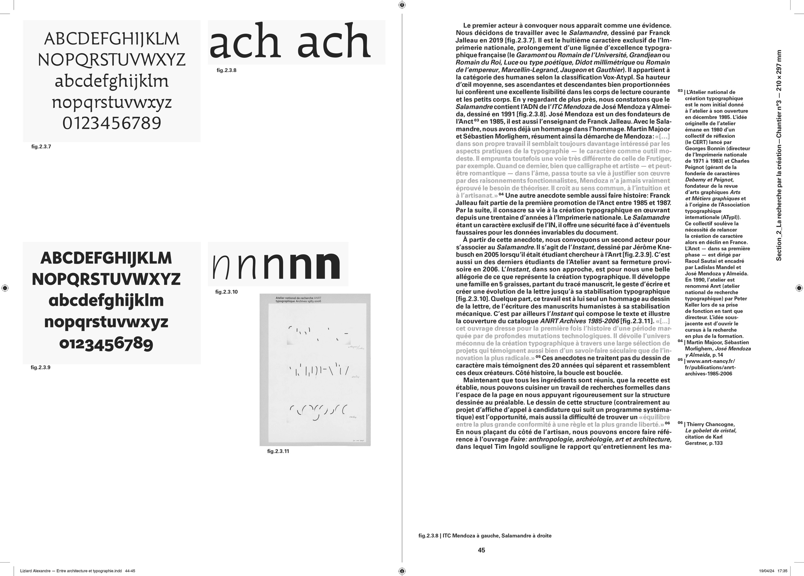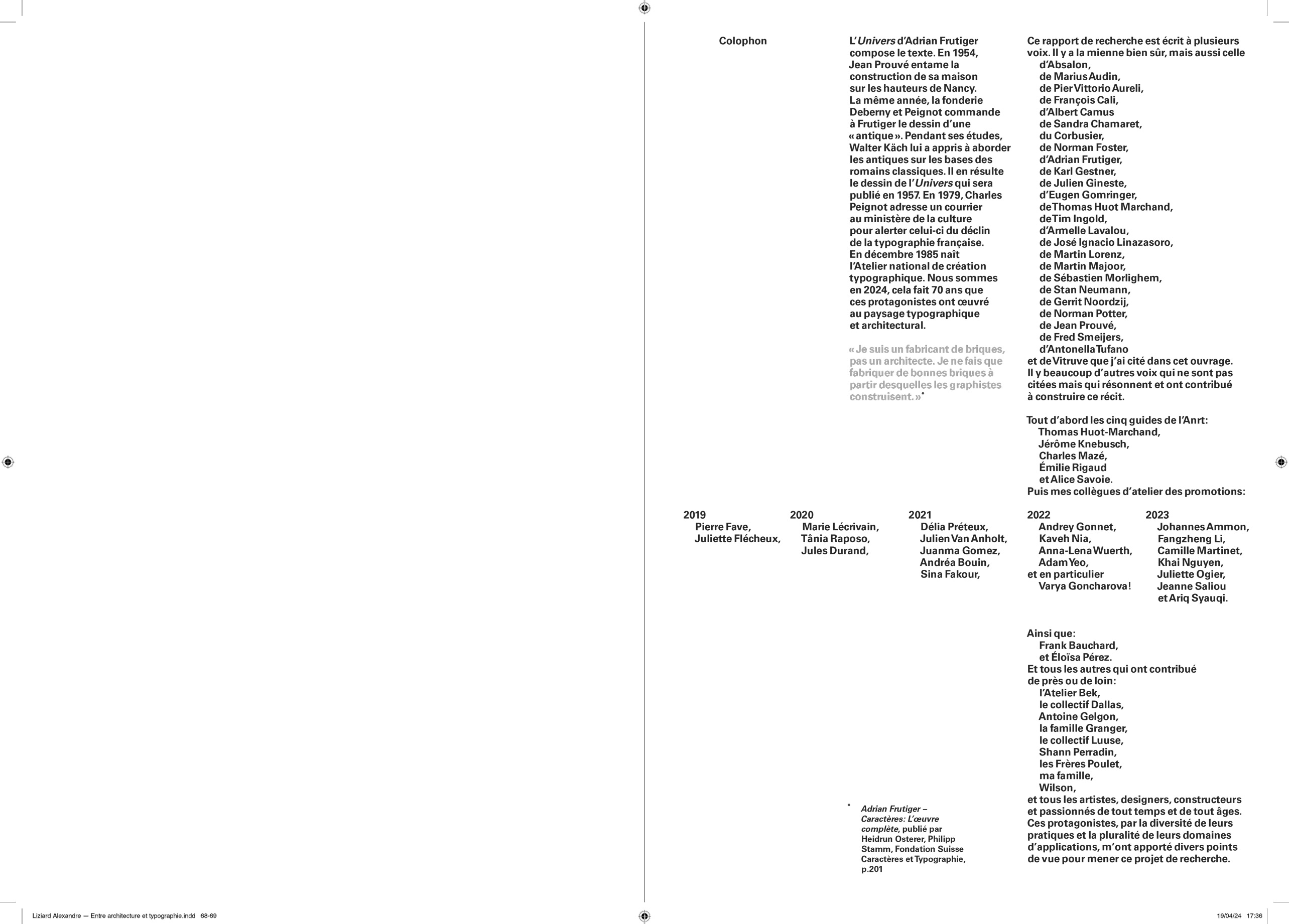 Comme pour chaque projet éditorial, j’entame une « enquête » typographique pour opérer les meilleurs choix que m’offre l’Histoire. Au cours de cette recherche, je suis tombé sur le travail que Lorène Ceccon a réalisé durant son Erasmus à la Cambre (2014). La numérisation du caractère Antiqua issu des casses de l’ÉnsAV, dessiné par le peintre Georges Lemmen, commandé par Henry Van de Velde, ancien directeur de la Cambre et proche de Walter Gropius, directeur du Bauhaus. J’apprends par la suite que ce caractère, a été commandé pour mettre en page le célèbre « Ainsi parlait Zarathustra » de Nietzsche — Also Sprach Zarathustra — en 1908 . L’imprimerie de l’ÉnsAV héberge aussi le Futura, caractère linéale géométrique conçue par Paul Renner, entre 1924 et 1927, pour la fonderie Bauer. Elle participe avec les productions de Jan Tschichold, à la modernité contemporaine du Bauhaus. C’est avec ces deux caractères que j’entamerais la mise en forme du texte de Friedrich Nietzsche.