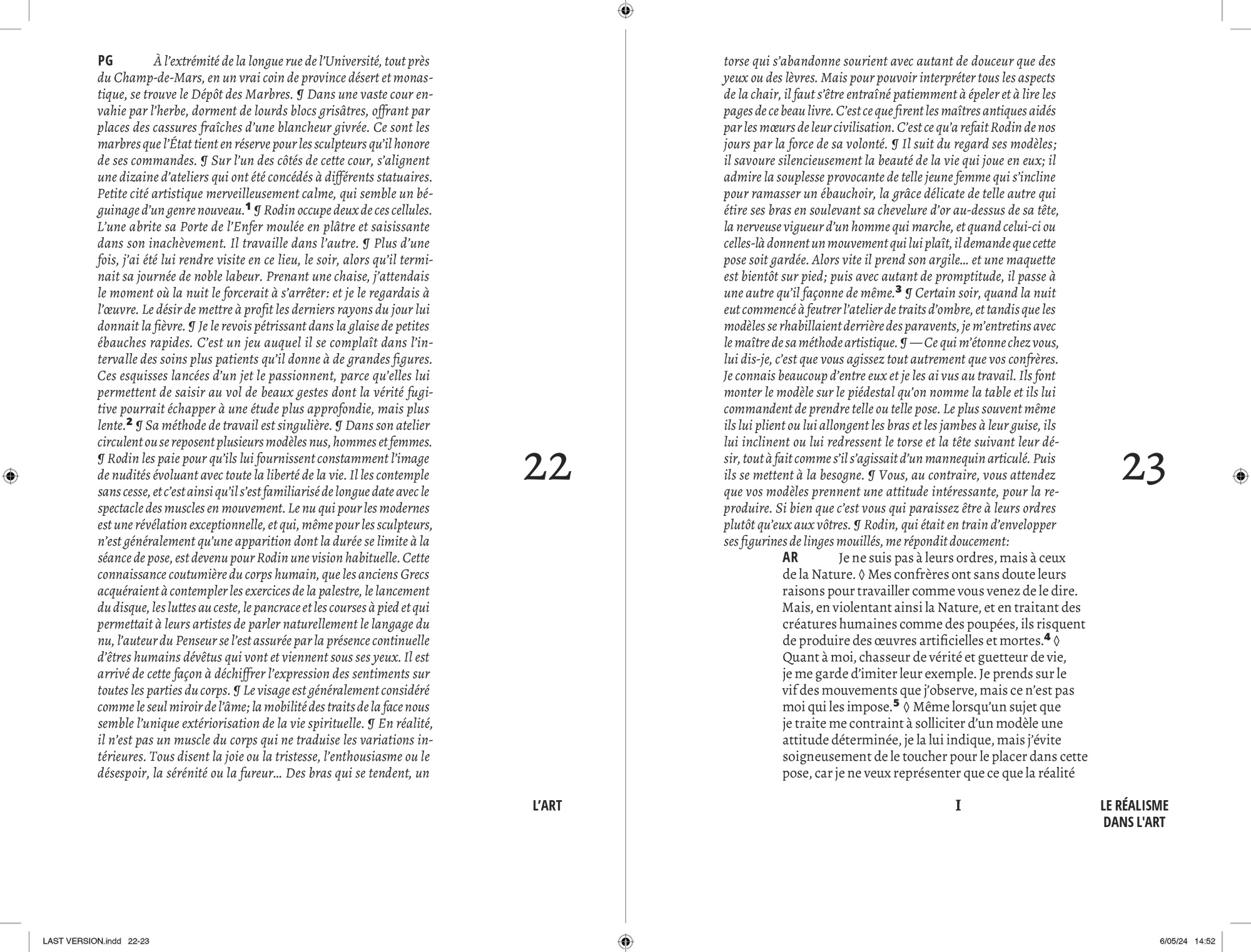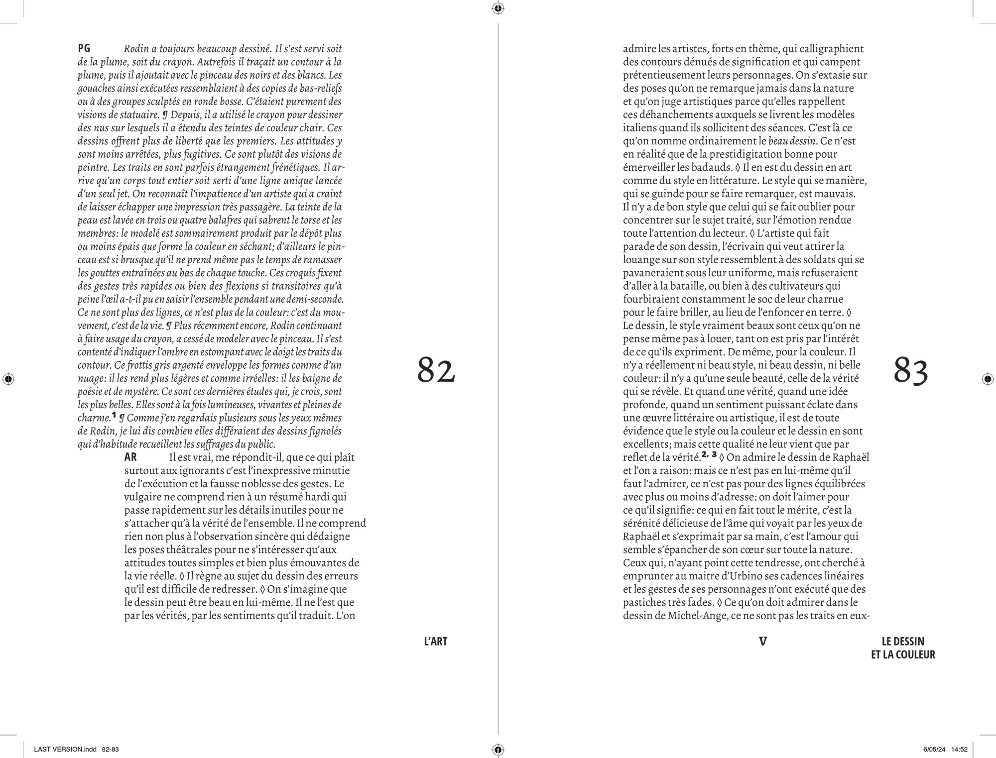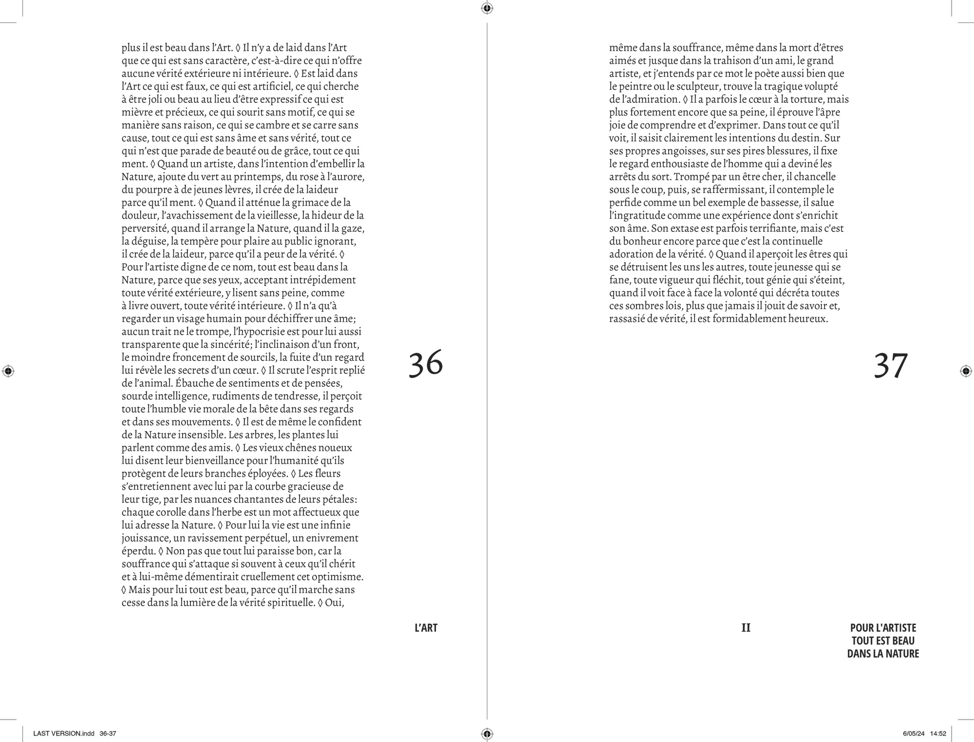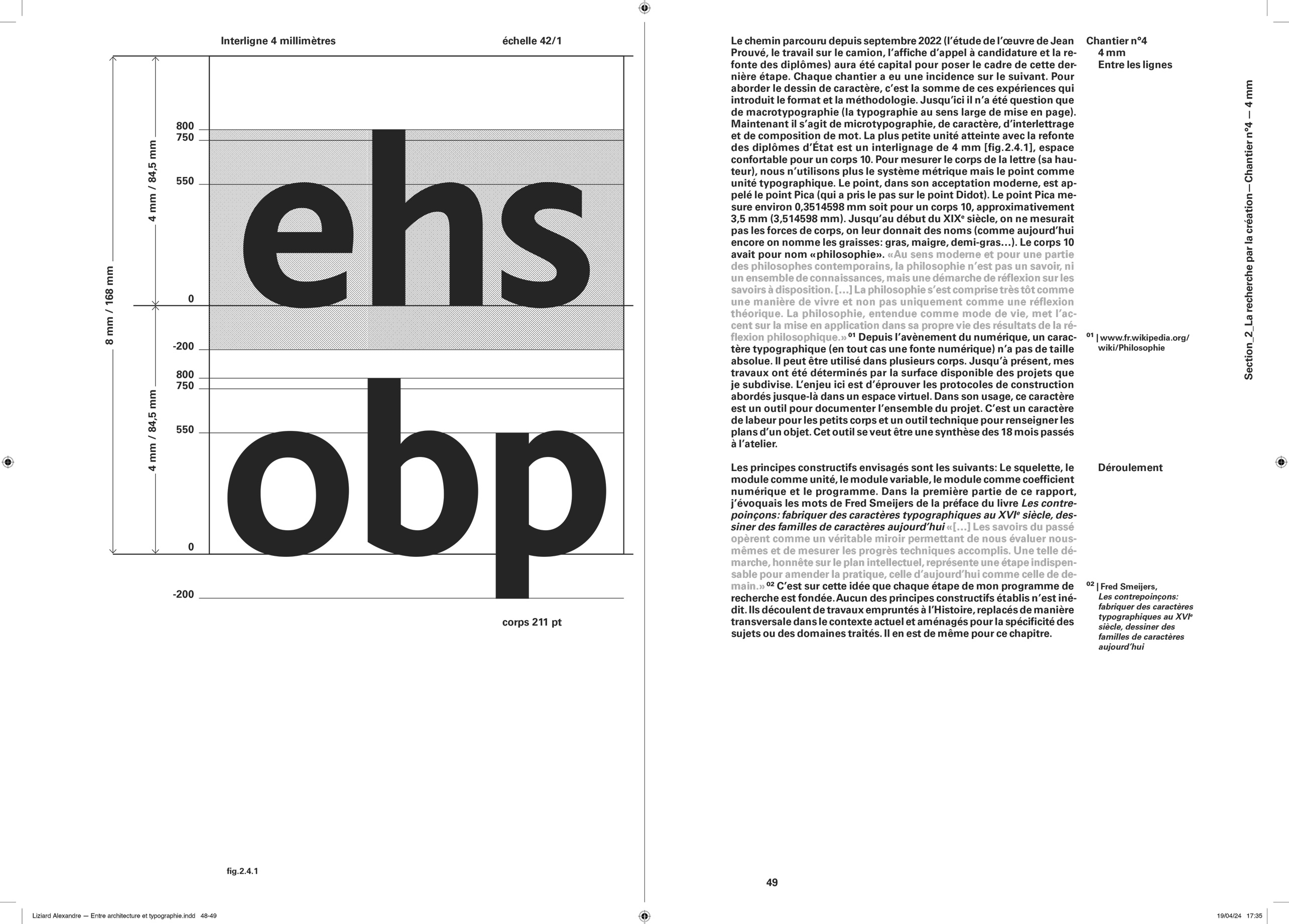 Comme pour chaque projet éditorial, j’entame une « enquête » typographique pour opérer les meilleurs choix que m’offre l’Histoire. Au cours de cette recherche, je suis tombé sur le travail que Lorène Ceccon a réalisé durant son Erasmus à la Cambre (2014). La numérisation du caractère Antiqua issu des casses de l’ÉnsAV, dessiné par le peintre Georges Lemmen, commandé par Henry Van de Velde, ancien directeur de la Cambre et proche de Walter Gropius, directeur du Bauhaus. J’apprends par la suite que ce caractère, a été commandé pour mettre en page le célèbre « Ainsi parlait Zarathustra » de Nietzsche — Also Sprach Zarathustra — en 1908 . L’imprimerie de l’ÉnsAV héberge aussi le Futura, caractère linéale géométrique conçue par Paul Renner, entre 1924 et 1927, pour la fonderie Bauer. Elle participe avec les productions de Jan Tschichold, à la modernité contemporaine du Bauhaus. C’est avec ces deux caractères que j’entamerais la mise en forme du texte de Friedrich Nietzsche.